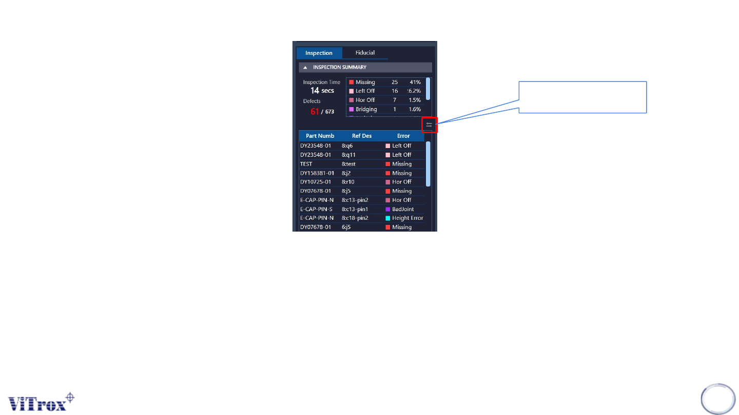 Copyright © ViT rox All Rights Reserved . Inspection Result The inspection result list is used to show the latest board post-inspection summary . Before any inspection starts, the inspection result is empty . There are f…