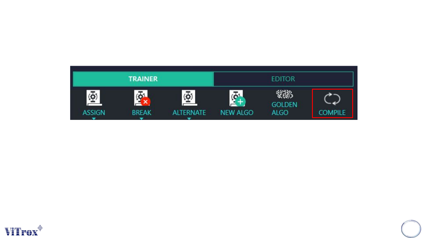 Copyright © ViT rox All Rights Reserved . Compile Note: T o save the current changes, If there any changes especially doing fine tuning, make sure please compile before run the inspection. 159 Figure 147: Compile Feature