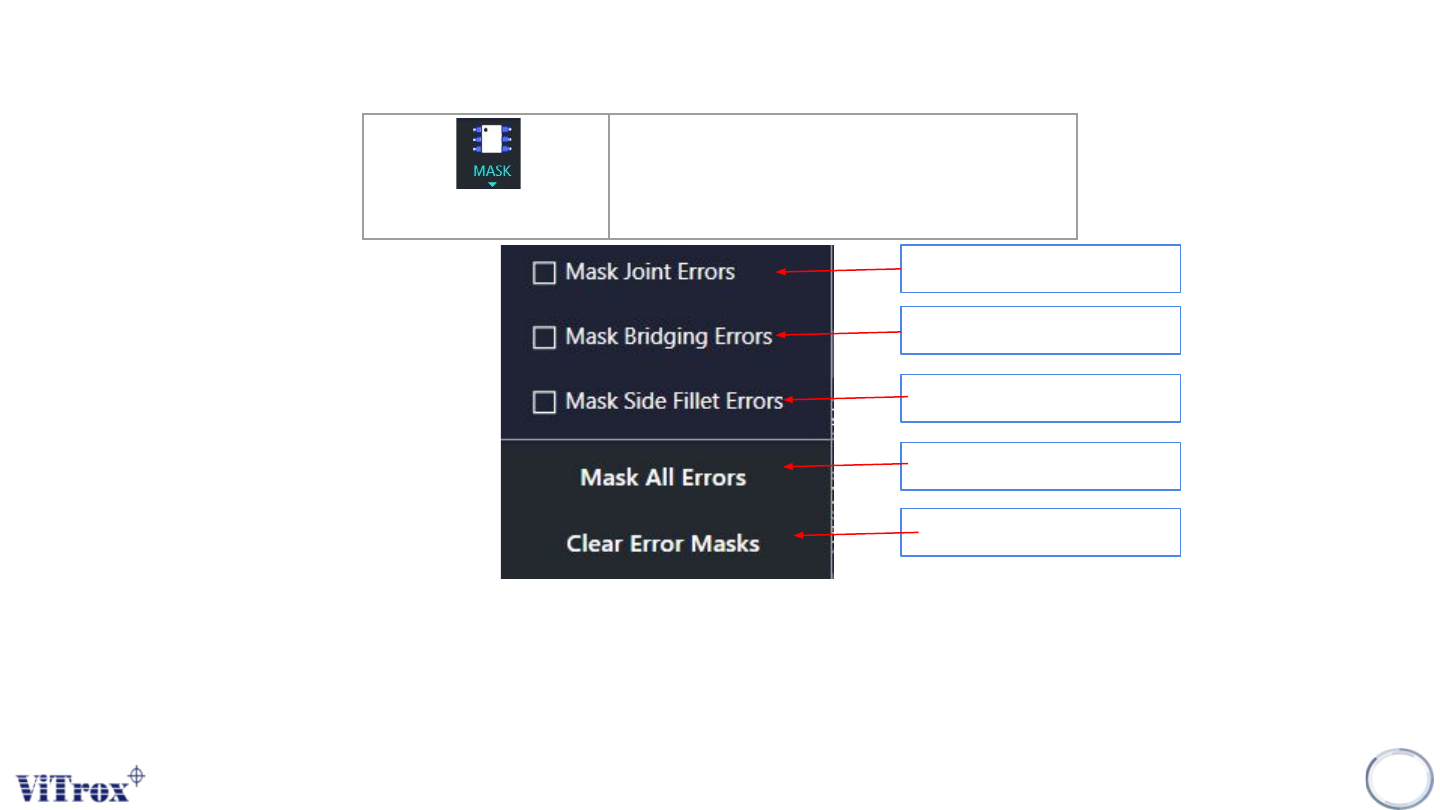 Copyright © ViT rox All Rights Reserved . Editor T ool 171 Mask Perform masking on certain location of component Figure 159: List of feature in Masking Mask specific Joint Errors Mask the bridging error Note: All the mas…