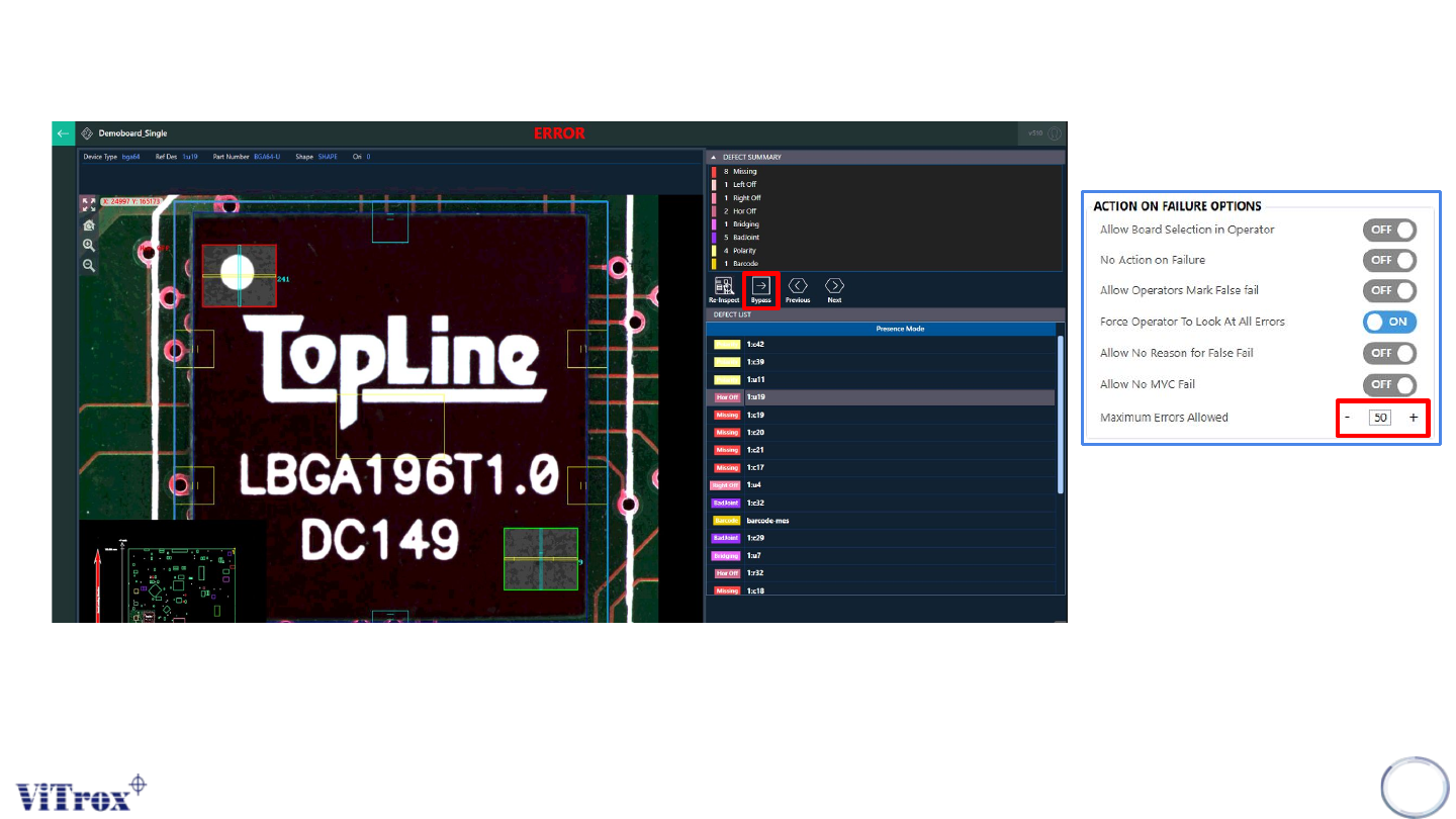 Copyright © ViT rox All Rights Reserved . General Setting (Action on Failure Options) When the maximum errors allowed is set to 50 and the defect calls are 19, it is yet to exceed the maximum errors allowed. The board ca…