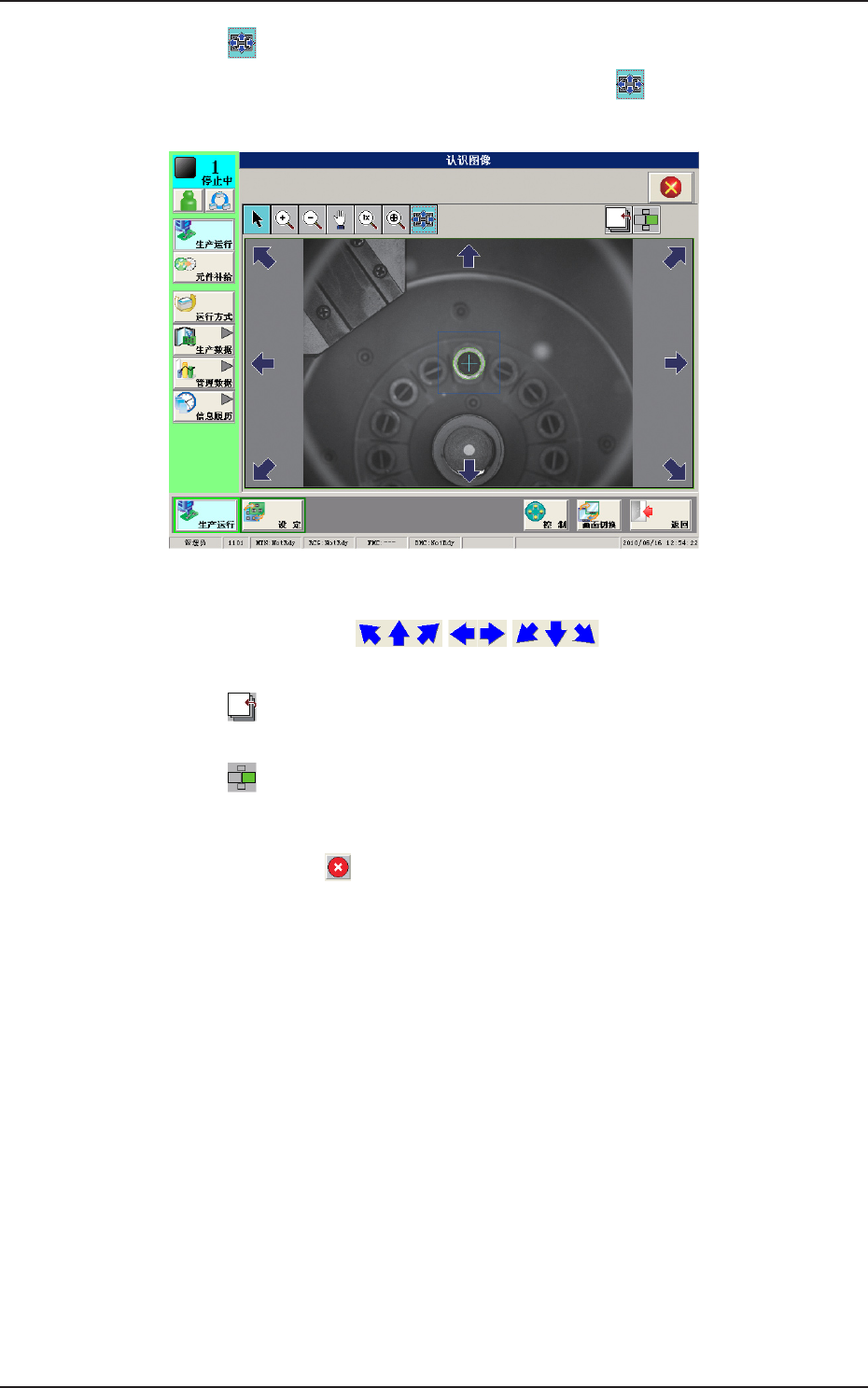 1OM-1752 2-12 1304-001 2.2识别界面 [ ] 按钮 : 满画布显示模式 ( 在识别图像显示领域中满画布显 示图像。) 按下 [ ] 按钮移行到满画布显示模式后 ( 指针 形状变为 记号。),触摸想要满画布显示的图像 或在图像上点击鼠标的左按钮,图像便以指针位 置为中心被满画布显示。 想要固定位置而在识别图像显示领域上满画布显 示图像时,请将指针对准图像的中心后,进行满 画布显示模式下的显…