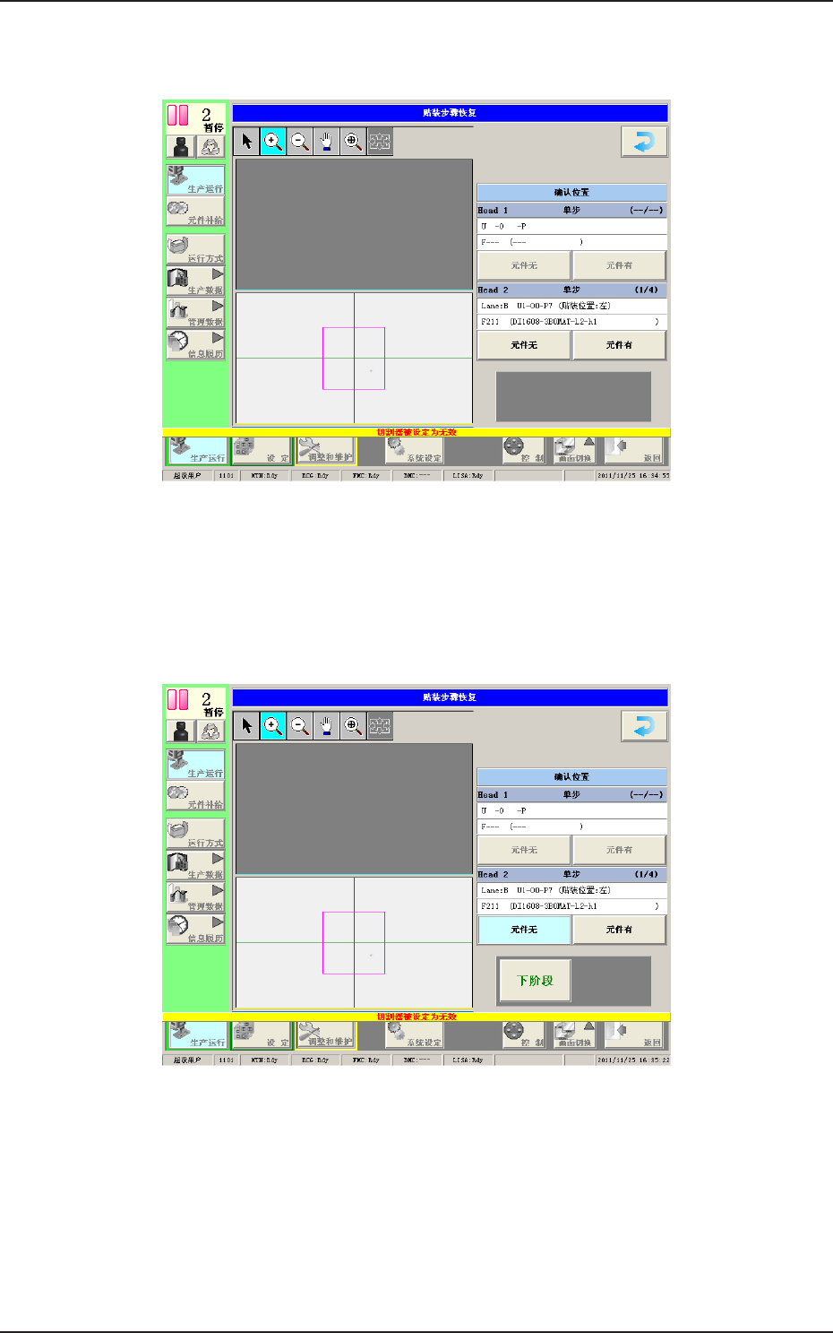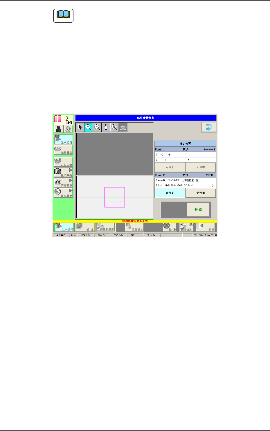1OM-1752 3-51 Note (a) 元件贴装中出现异常时,显示异常界面。请参照异常显示界面内容, 排除原因后再次进行贴装恢复。 (b) 从 “ 生产 ” 界面重新显示 “ 贴装步骤恢复 ” 界面时,使用以下方法。 • 按下 [ 运行方式 ] → [ 运行模式 ] 界面中显示的 [ 贴装恢复 ] 按钮。 • 在操作员信息中显示 “ 贴装恢复可能 ” 时,按下操作台的 [START] 按钮。 (4) 对显示的所有步骤进行步骤 (…