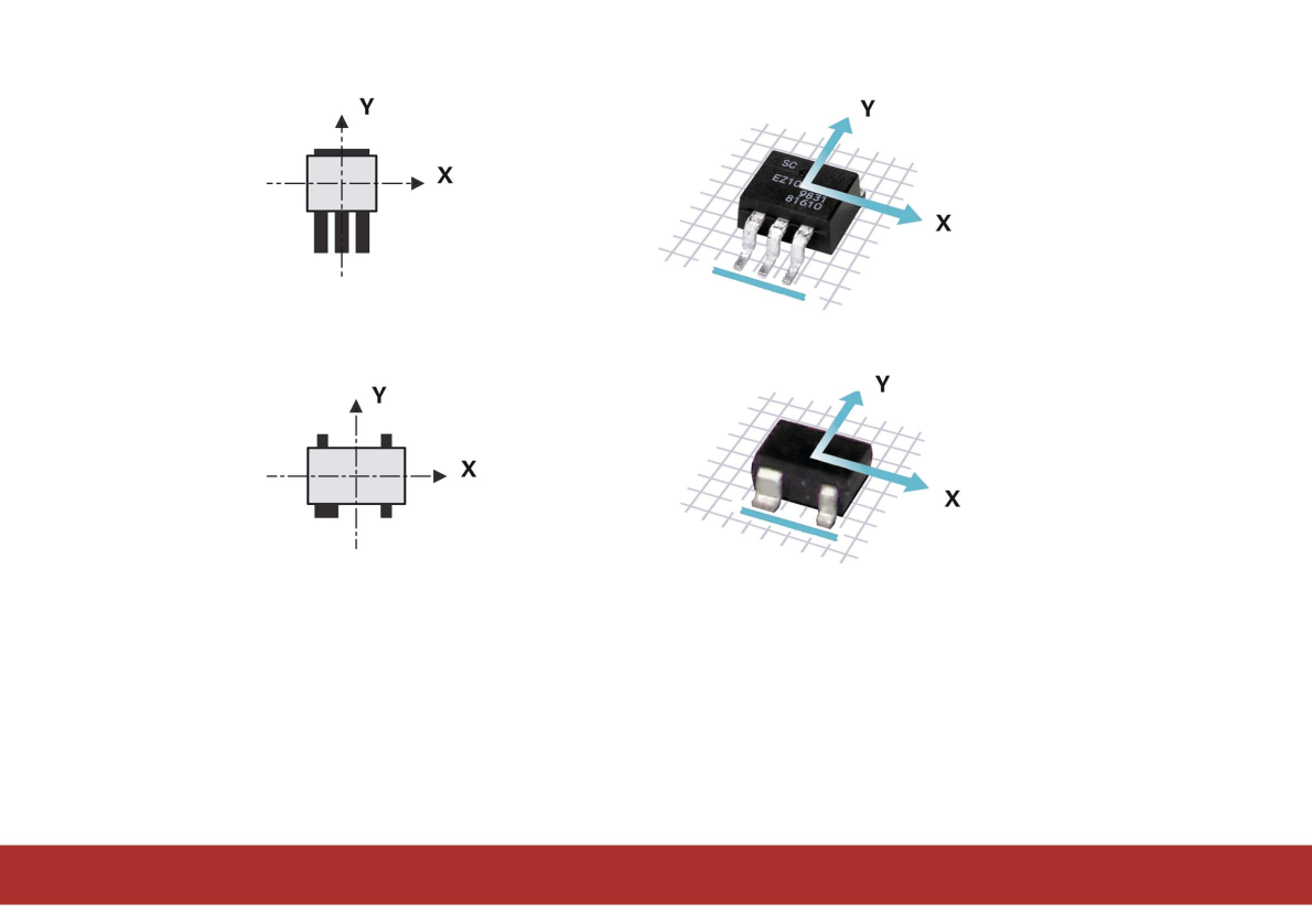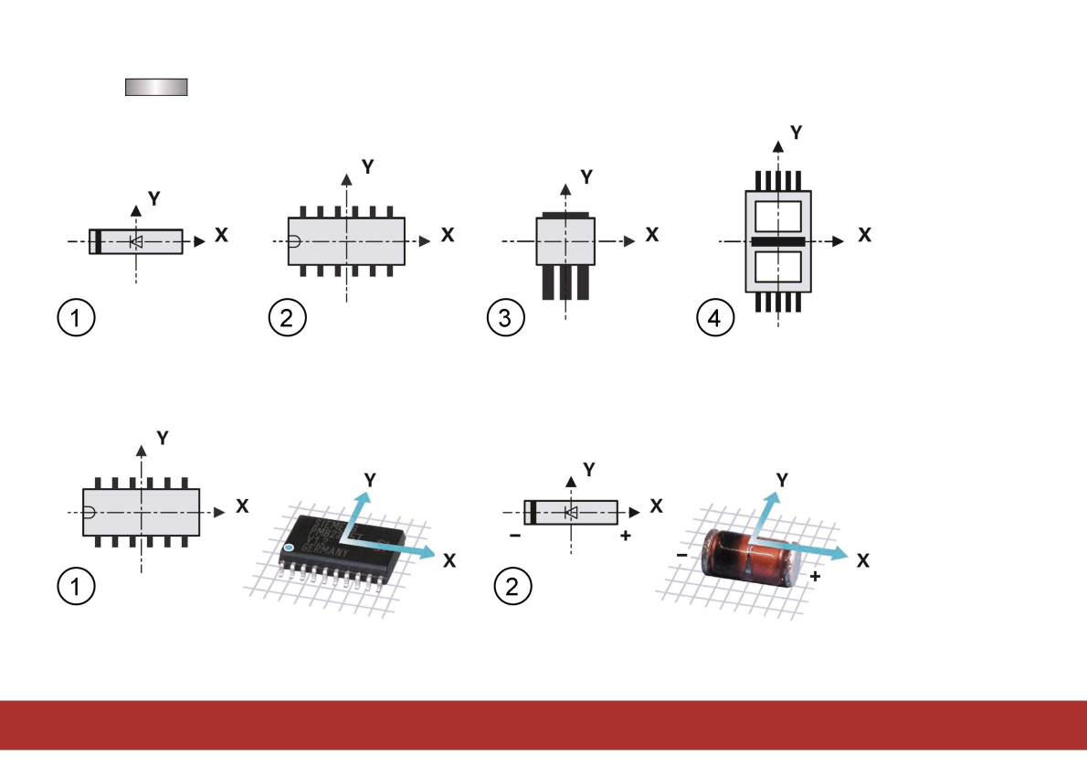 引腳1位於底部、左角或組件左側的中心。對於二極管,陽極(+)必須指向正X方向。