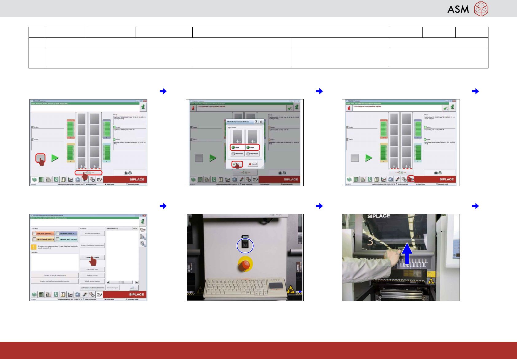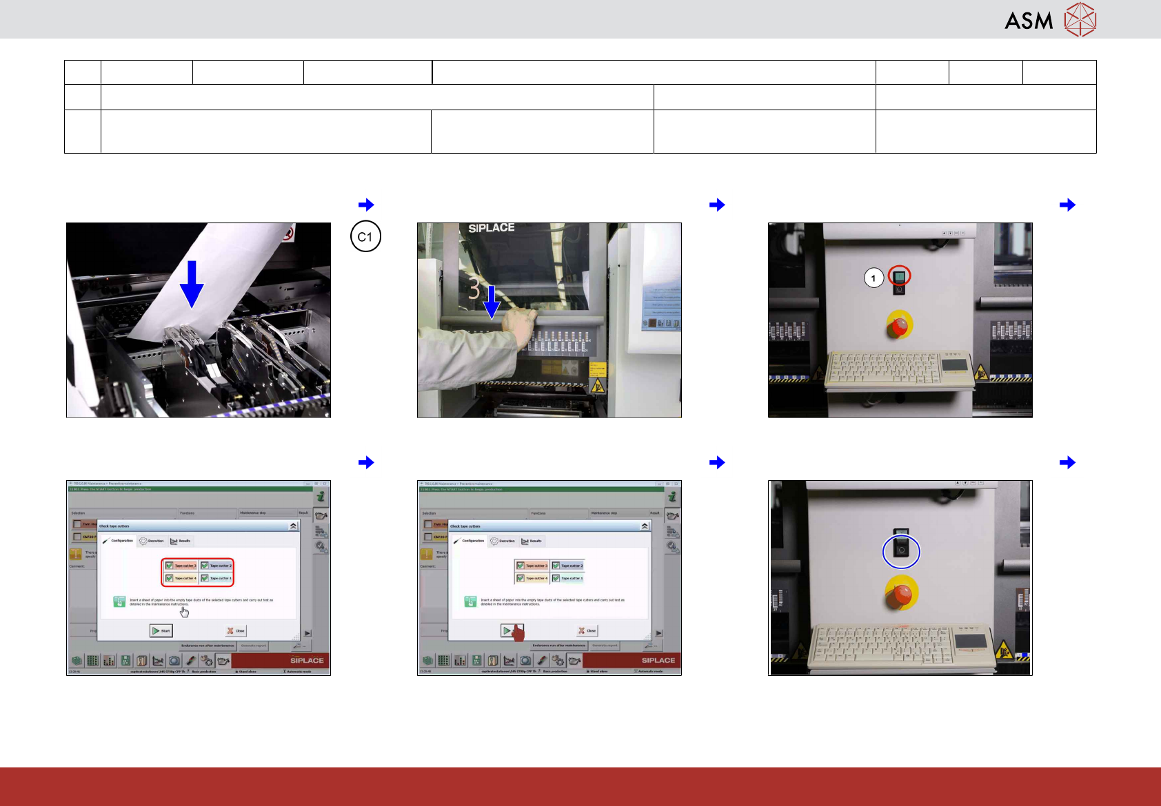 1 WF4 X_系列 S 测试料带切割器 2 分钟 1 / 3 注 意 开 始 维 护 前 , 请 参 阅 用 户 手 册 中 的 安 全 说 明 贴片机状态开启 传送系统空 注意!遵守防静电守则 工具: 易损件: 耗材: C1 www.asm-smt.com 1 停止生产并点击“阻挡传送”图标。 2 阻挡两个轨道并点击“确定”图标。 3 点击“维护”图标。 4 点击“检查料带切割器”图标。 5 按下“停止”按钮。 6 打开保护盖。