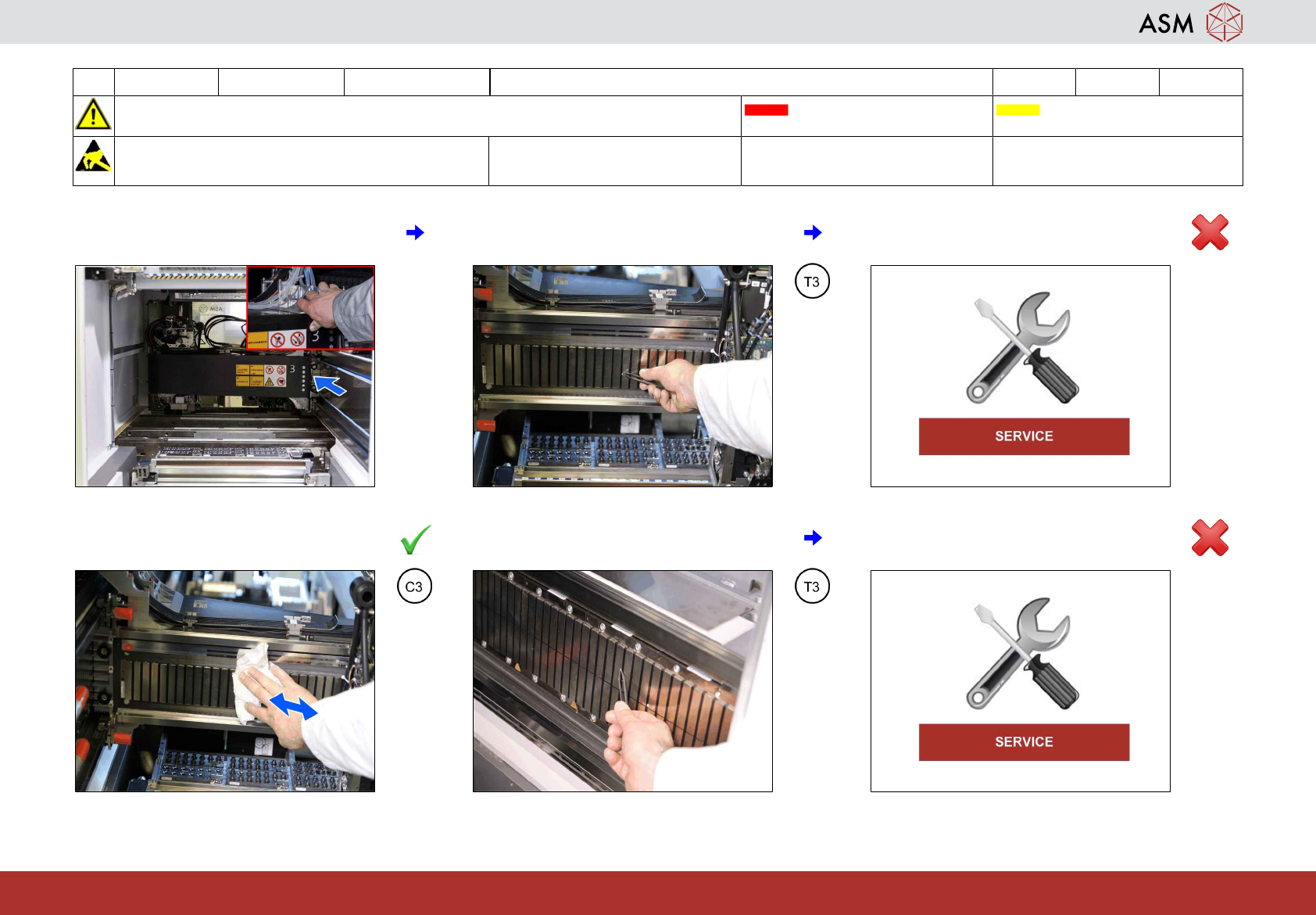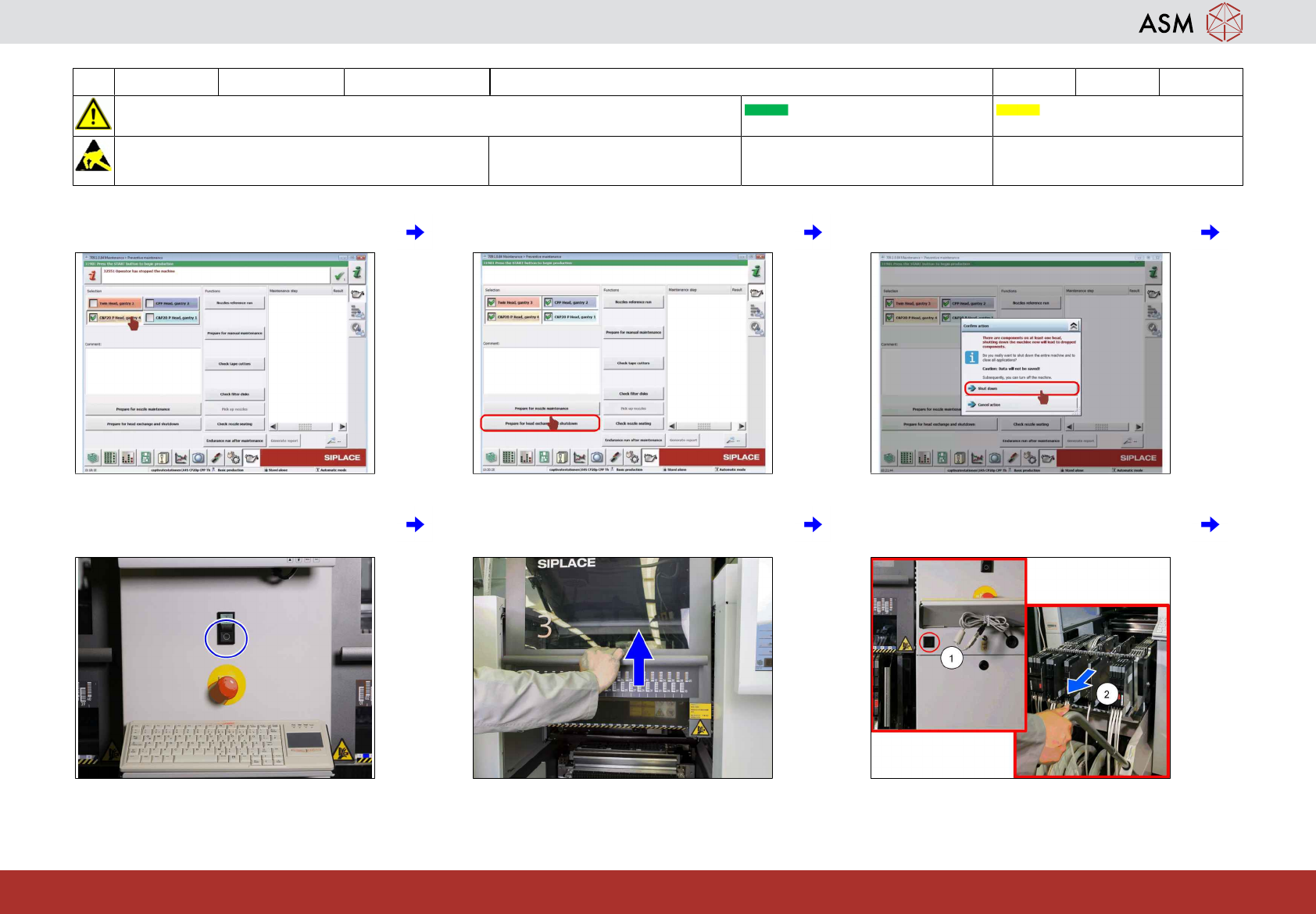 2 WF4 X_系列 S 关闭贴片机,移除料台 (COT) 并更换所有吸嘴 8分钟 1 / 2 注 意 开 始 维 护 前 , 请 参 阅 用 户 手 册 中 的 安 全 说 明 贴片机状态开启 传送系统空 注意!遵守防静电守则 工具: 易损件: W1, W2, W35 耗材: www.asm-smt.com 1 选择所有贴片头。 2 点击“准备更换并关机”图标。 3 点击“关机”图标。 4 按下“停止”按钮。 5 打开保护盖。 6…