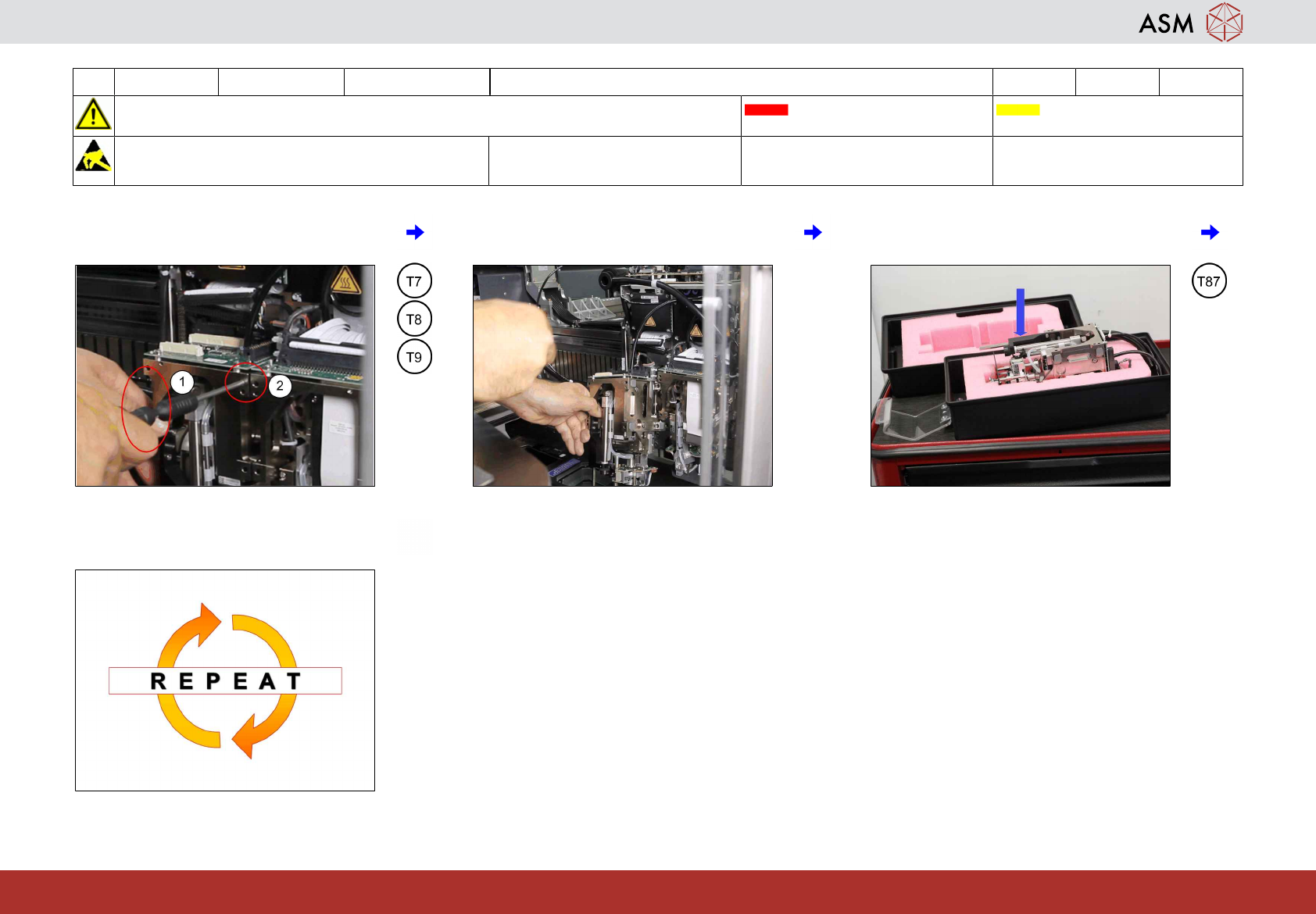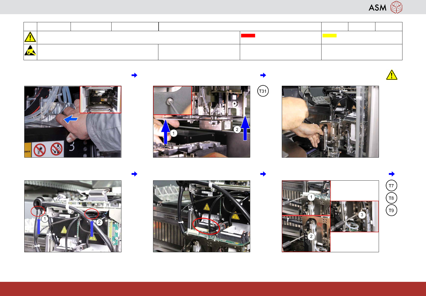 4 WF4 X_系列 S 取出双头 10 分钟 2 / 2 注 意 开 始 维 护 前 , 请 参 阅 用 户 手 册 中 的 安 全 说 明 贴片机状态 关闭 传送系统空 注意!遵守防静电守则 工具: T7、T8、T9、T31、T87 易损件: 耗材: www.asm-smt.com 7 按住段位器 (1),拆下剩余的一颗固定螺丝 (2)。 8 取下 TwinHead 模块。 9 将模块放入运输盒中。 10 对于右侧 TwinHe…