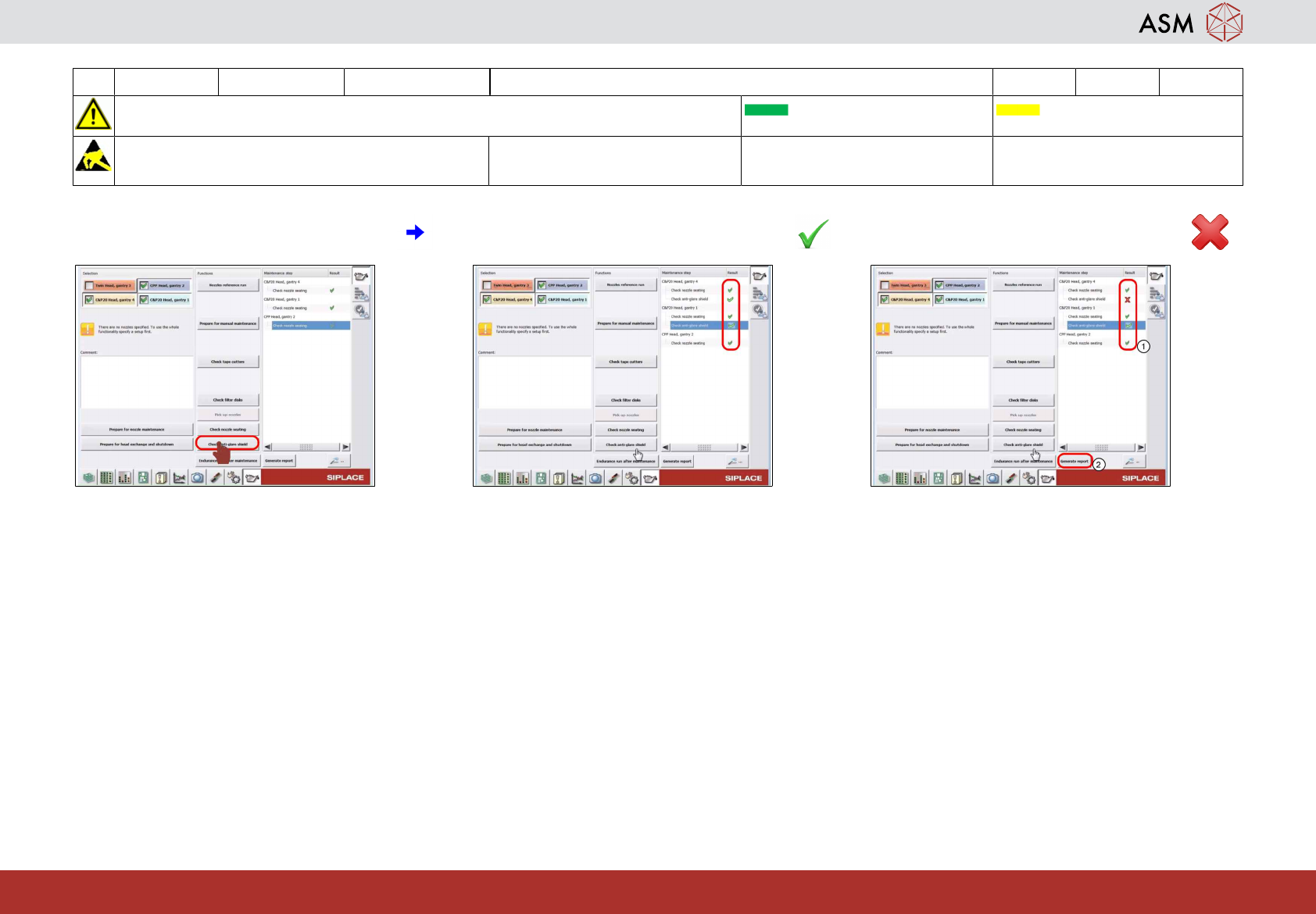 20 WF4 X_系列 S 检查防眩板:C&P20 A 2 分钟 1 / 1 注 意 开 始 维 护 前 , 请 参 阅 用 户 手 册 中 的 安 全 说 明 贴片机状态开启 传送系统空 注意!遵守防静电守则 工具: 易损件: 耗材: www.asm-smt.com 1 点击“检查防眩板”图标。 2 检查结果是否正常(绿色勾)。 3 如果结果不正常 (1),请生成报告 (2) 并联 系维修人员。