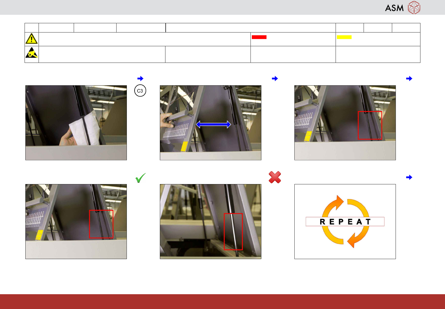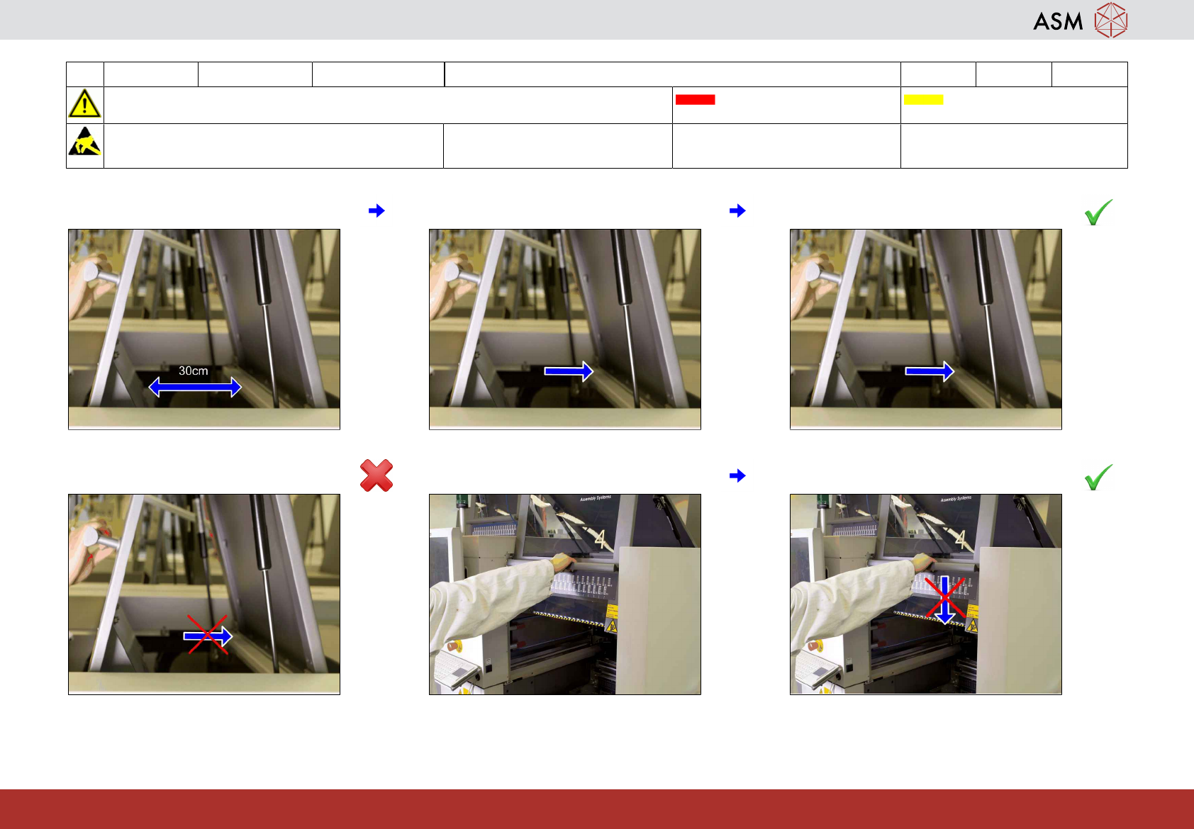 7 WF4 X_系列 S 检查并清洁气压减震器 4分钟 2 / 3 注 意 开 始 维 护 前 , 请 参 阅 用 户 手 册 中 的 安 全 说 明 贴片机状态 关闭 传送系统空 注意!遵守防静电守则 工具: 易损件: 耗材: C3 www.asm-smt.com 7 将保护盖定位到 30 cm 处。 8 观察保护盖是否返回。 9 如正常,转至第 11 步。 10 如不正常,请联系维修人员。 11 将保护盖放到中间位置。 12 如…