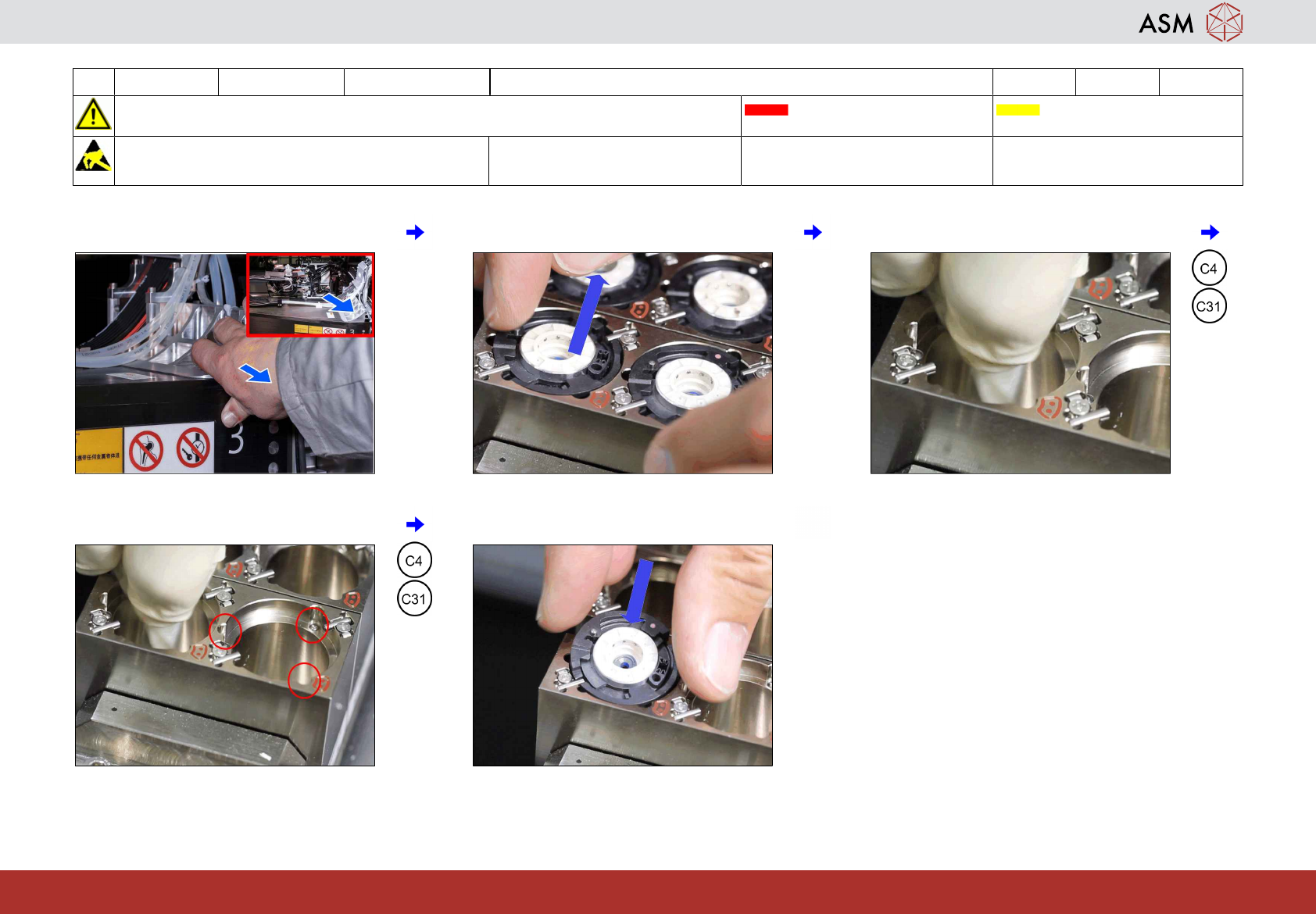 12 WF4 X_系列 S 清洁并润滑吸嘴交换器双头 3分钟 1 / 1 注 意 开 始 维 护 前 , 请 参 阅 用 户 手 册 中 的 安 全 说 明 贴片机状态 关闭 传送系统空 注意!遵守防静电守则 工具: 易损件: 耗材: C4、C31 www.asm-smt.com 1 将悬臂移动到传送系统上方。 2 清除全部吸嘴。 3 清洁吸嘴库。 4 确保弹簧锁可得到妥善的清洁。 5 装回全部吸嘴。