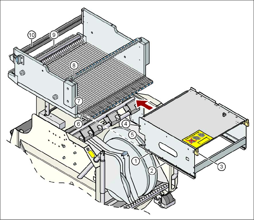 (5) 锁定滚轮 (10) 元件料台上用于固定 “前”对中销的对中孔