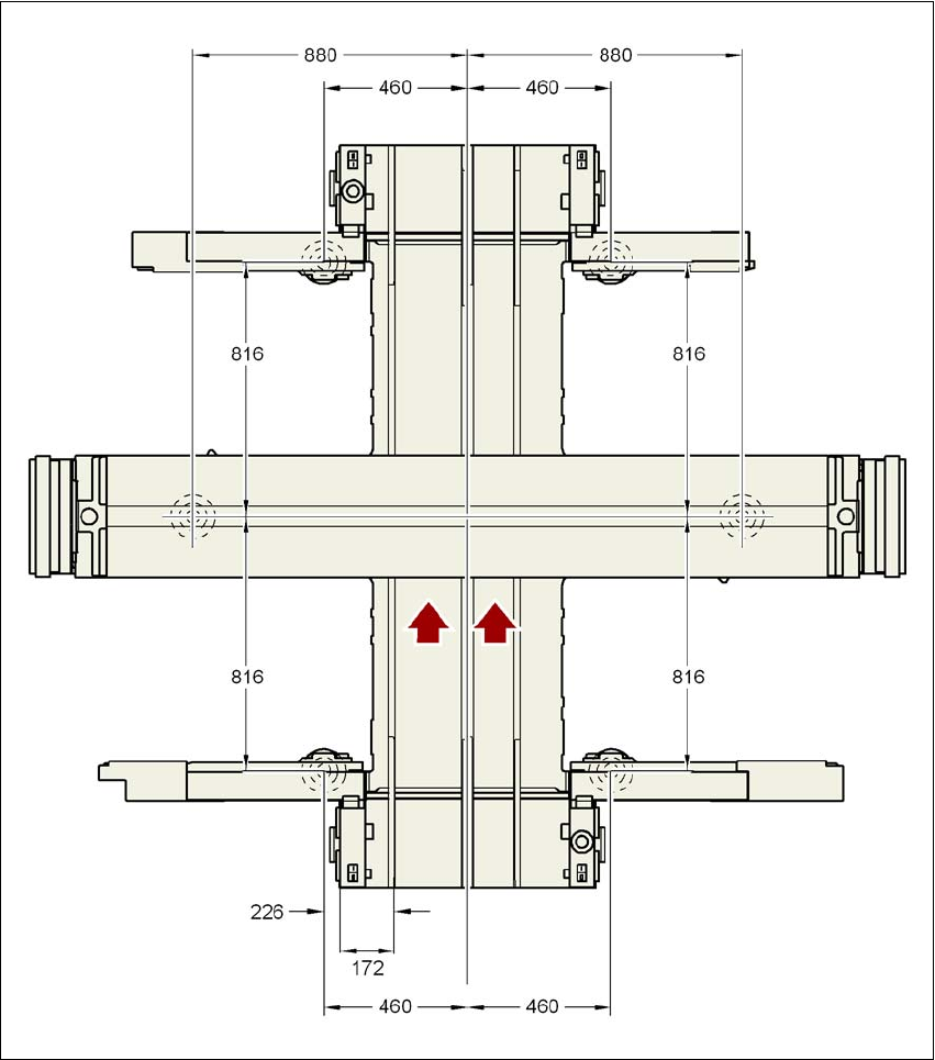 4 安装和试运行 用户手册 SIPLACE X 系列 4.3 安装贴片机 源自软件版本 SR.70x.xx 2011 年 1 月中文版 274 4.3.16.5 贴 片机支脚和四通道传送导轨 间隙 4 4 4 4 图 4.3 - 27 贴片机支脚和四通道传送导轨 间隙 (毫米) - 输出侧静止传送导轨边缘,间距 为 535 毫米