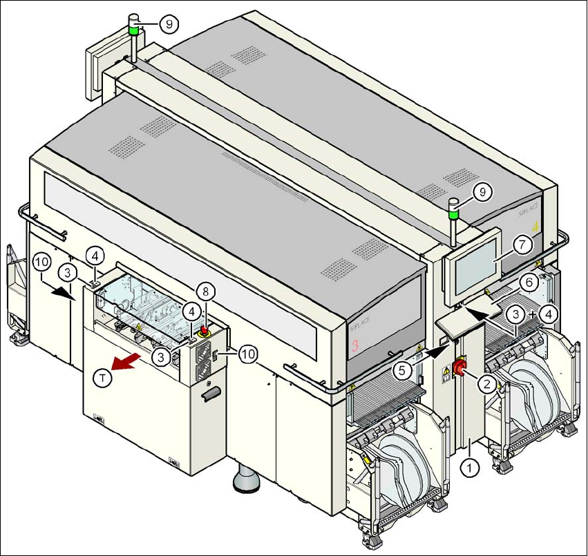 5 贴片机的使用 用户手册 SIPLACE X 系列 5.2 控制部件和显示装置 源自软件版本 SR.70x.xx 2011 年 1 月中文版 296 5.2.2 说明 身高 1.40 米的人可触摸到所有控制部件 。 主电源开关 5 主电源开关用于接通、断开贴片机 电源。 警告 即使主电源开关关闭,贴片机内的 某些部件仍带有潜在的致命电 压。 5 Stop (停止) 按钮 5 按下此按钮即可停止贴片机的运行 。 Start (启动) 按…