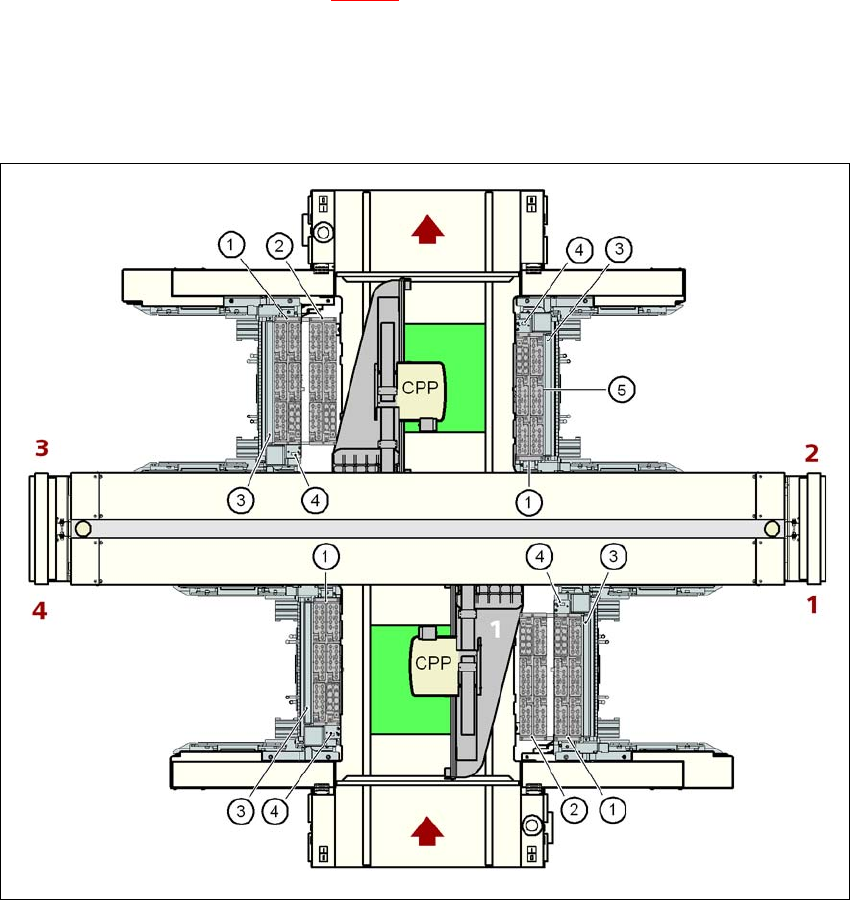 用户手册 SIPLACE X 系列 6 贴片机扩展部件 源自软件版本 SR.70x.xx 2011 年 1 月中文版 6.1 吸嘴交换器 369 6.1.2.6 X2 贴片机上 SIPLACE MultiSt ar 贴片头吸嘴交换器的位置 可以在 CPP 贴片头的位置 1 和 3 (图 6. 1 - 16 中的 1 和 2 )安 装 1 或 2 个吸嘴交换 器。 位置 2 和 4 可以安装一个吸嘴交换器。这样一来, 总计为 6 个吸嘴交…
