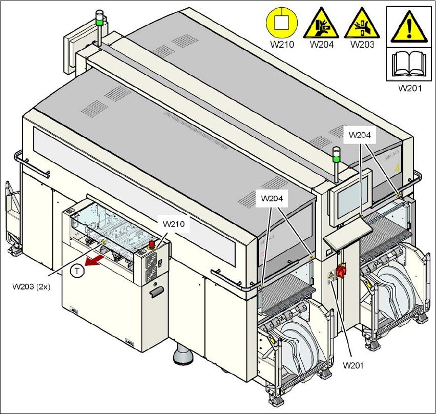 2 安全操作 用户手册 SIPLACE X 系列 2.2 警告标签 源自软件版本 SR.70x.xx 2011 年 1 月中文版 44 图 2.2 - 2 贴片机上的警告标签 W203 、 W204 和 W210 - 第 2 部分 位置 W203 ,部件号 03009 342-01 位置 W204 ,部件号 03009 343-01 位置 W210 ,部件号 03009 350-01 (T) PCB 行程方向 警告 2 -> 不要…