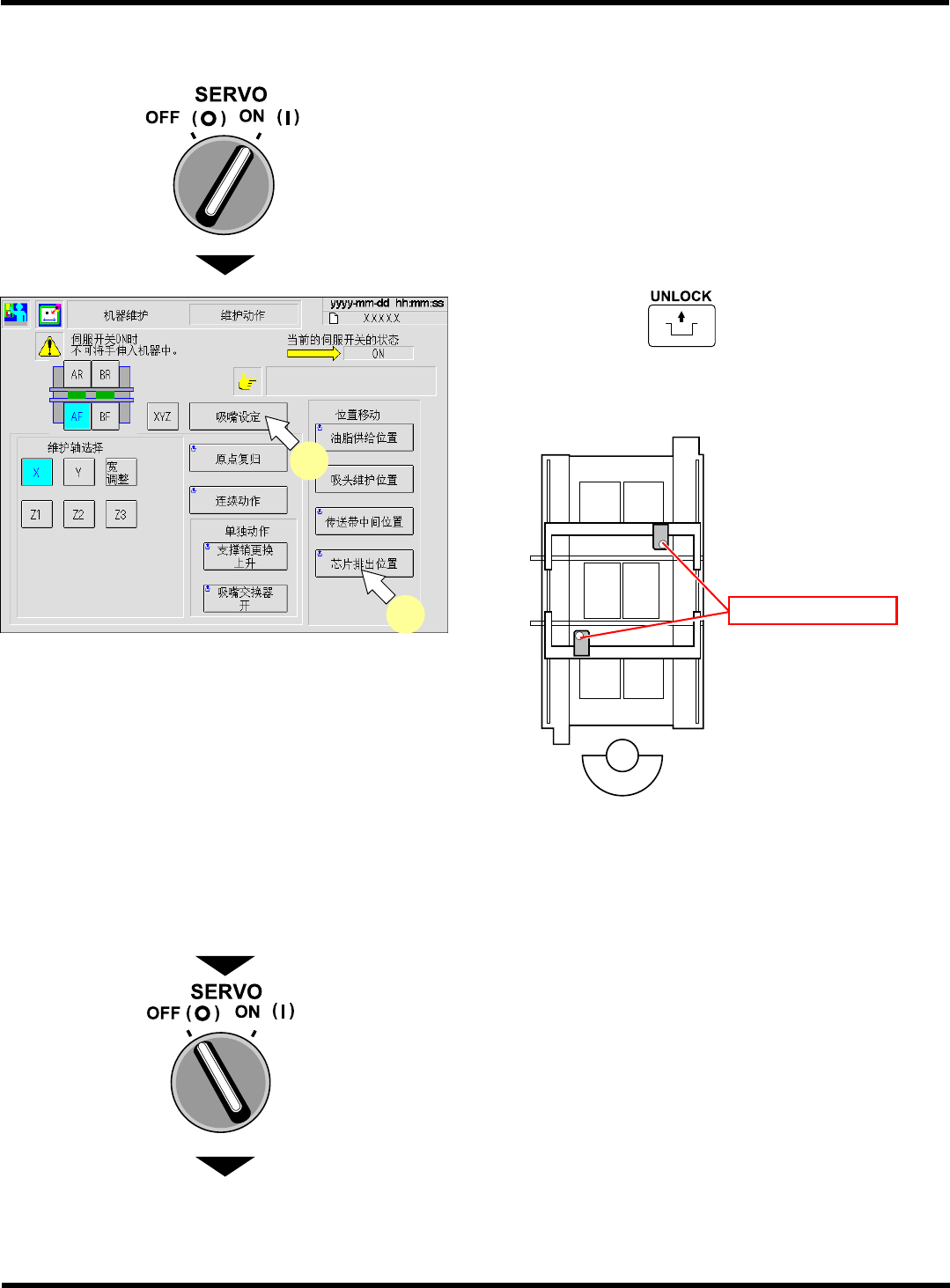 CM602-L 维修手册 1.4 140 时检查 小一 次 [ 一周一次 ] Page 1-72 4. 吸嘴的安装 1. 关闭安全盖,将伺服开关置于 ON ( I ) 。 2. 按操作面板的 + [ 芯片排出位 置 ] 。 • 吸头将移动到芯片排出位置上。 前面 3. 按 [ 吸嘴设定 ] 。 • [ 吸嘴设定 ] 的画面将被显示。 请在画面上确认吸 嘴配置的同时,进行如下步骤的操作 。 4. 将伺服开关置于 OFF (O) 。打开安全…