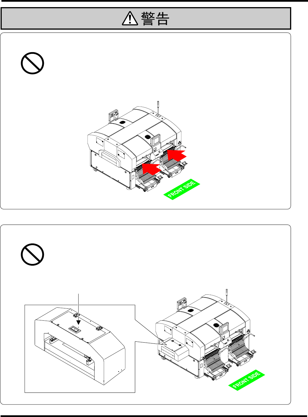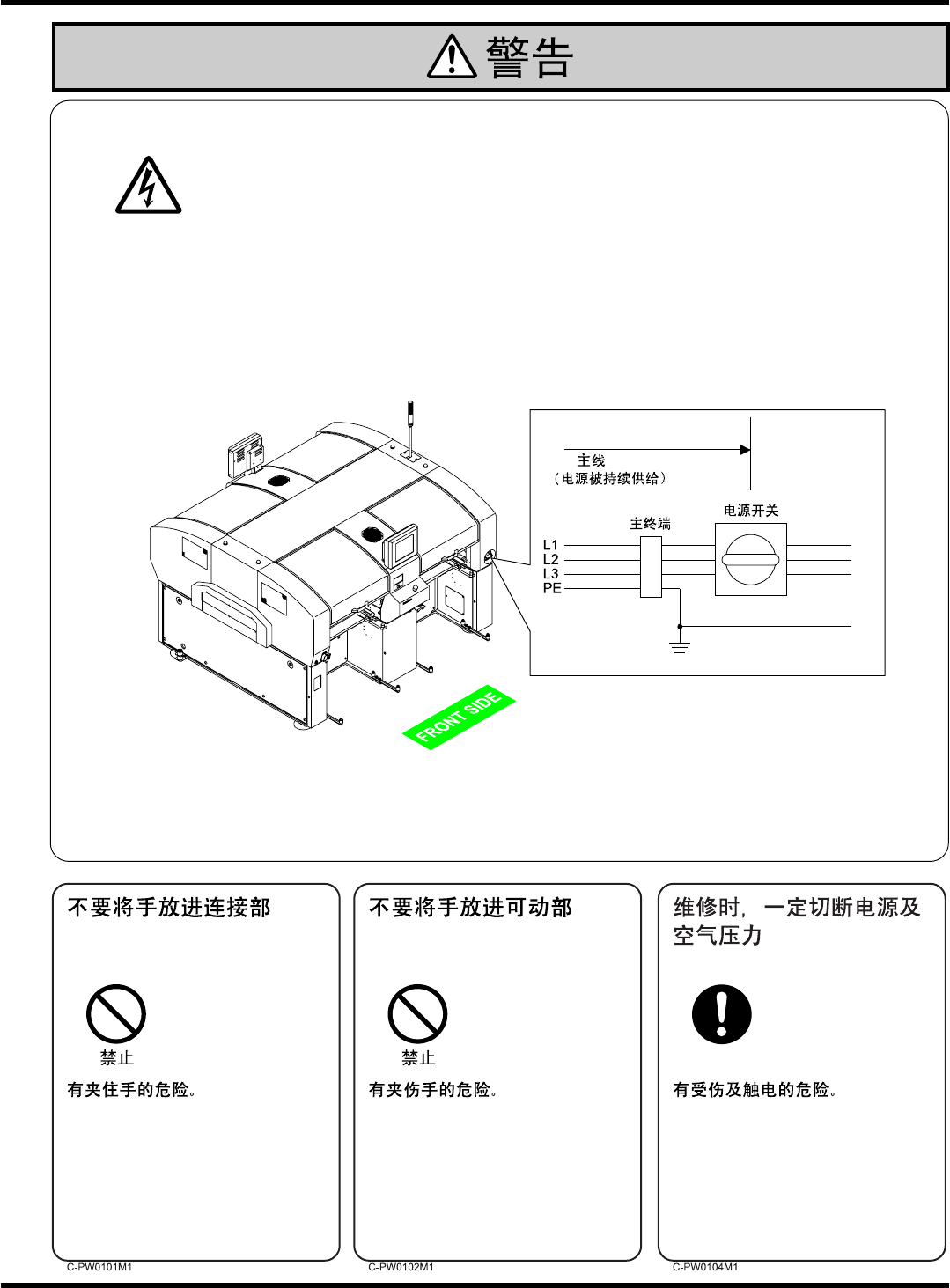 CM602-L 维修手册 20 不要将手放进供料器搭载台上的间隙里 机器内部的可动部有可 能伤害到手。 禁止 为了防止将手放进机器内部,推荐在台车上将所有供料器都设置好。 M114 延长传送带盖 ( 选购件 ) 不要在传送带盖打开的状态下进行作业 机器内部的可动部有可 能伤害到手。 禁止 盖 M115 EJM4A-A E01 E64C-010E EJM8A- C-XXC00-A03- 00 EJM4A-AC01