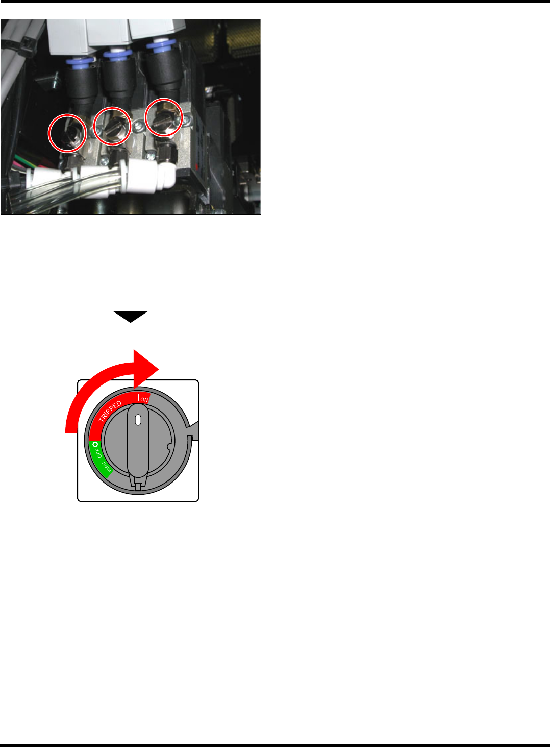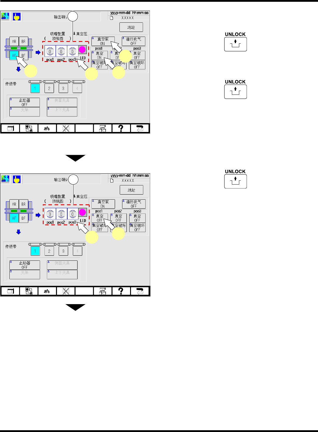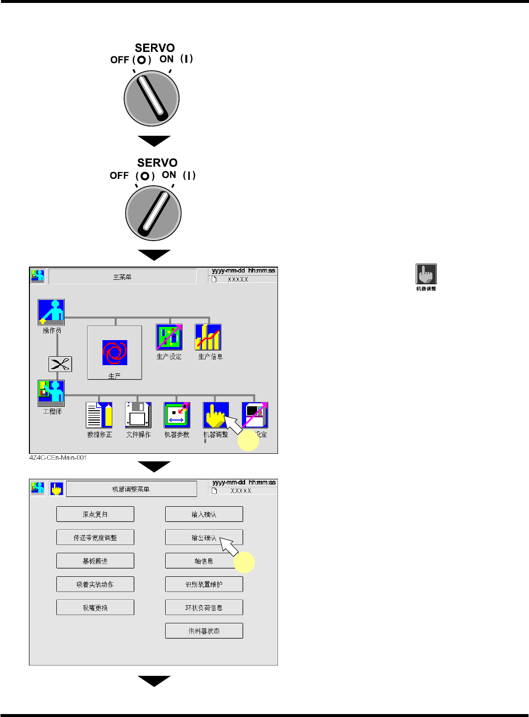 CM602-L 维修手册 1.10 换 消耗零件的更 Page 1-169 动作确认步骤 1. 将伺服开关置于 OFF (O) 。 2. 将吸嘴安装在更换完阀的 3 个吸头上。 3. 将伺服开关置于 ON ( I ) 。 4. 按 < 主菜单 > 画面的 。 • 机器调整的菜单画面将被显示。 5. 按 [ 输出确认 ] 。 • < 输出确认 > 画面将被显示。 下一页 EJM8A-C-MMC01-A05-01…