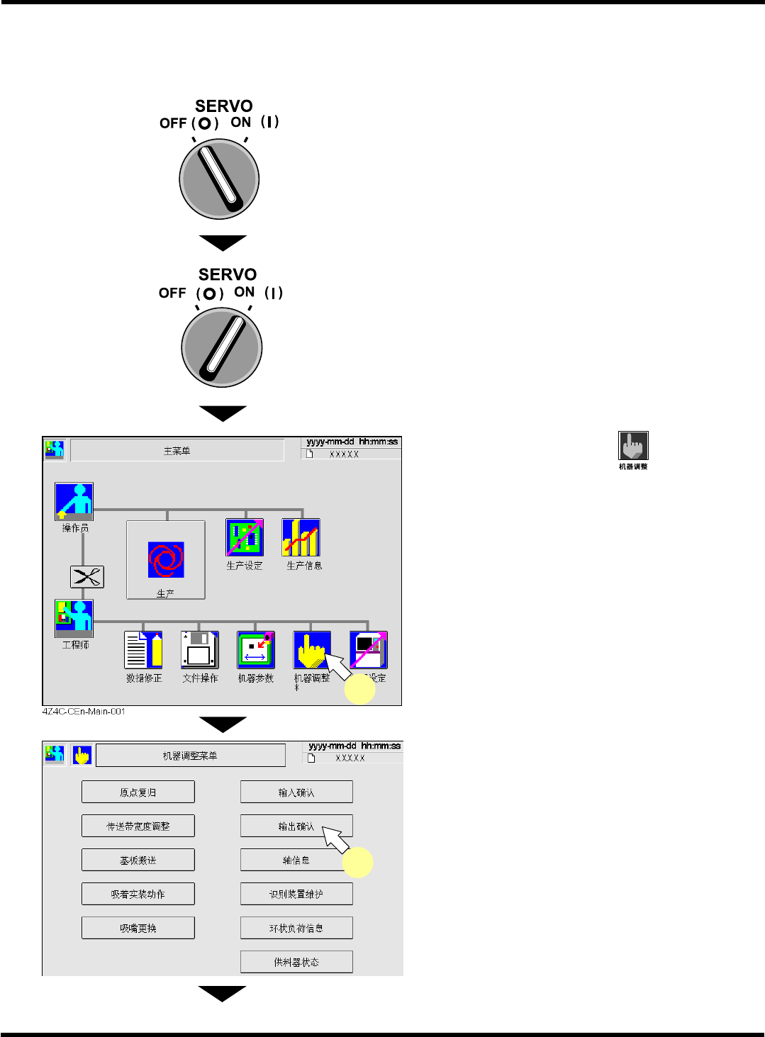 CM602-L 维修手册 1.10 换 消耗零件的更 Page 1-173 动作确认步骤 ∗ 在此以高速吸头 (12 吸嘴 ) 为例进行了说明,而对通用吸头 (8 吸嘴 ) 、多功能吸头也都应按照同 样步骤进行操作。 1. 将伺服开关置于 OFF (O) 。 2. 在换完清扫阀的工作台的吸头的 pos1 上 安装吸嘴。 3. 将伺服开关置于 ON ( I ) 。 4. 按 < 主菜单 > 画面上的 。 • 机器调整的菜单…