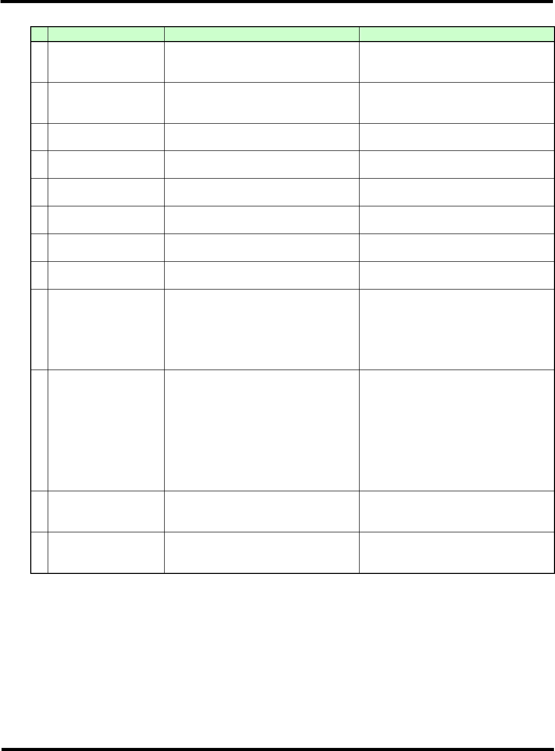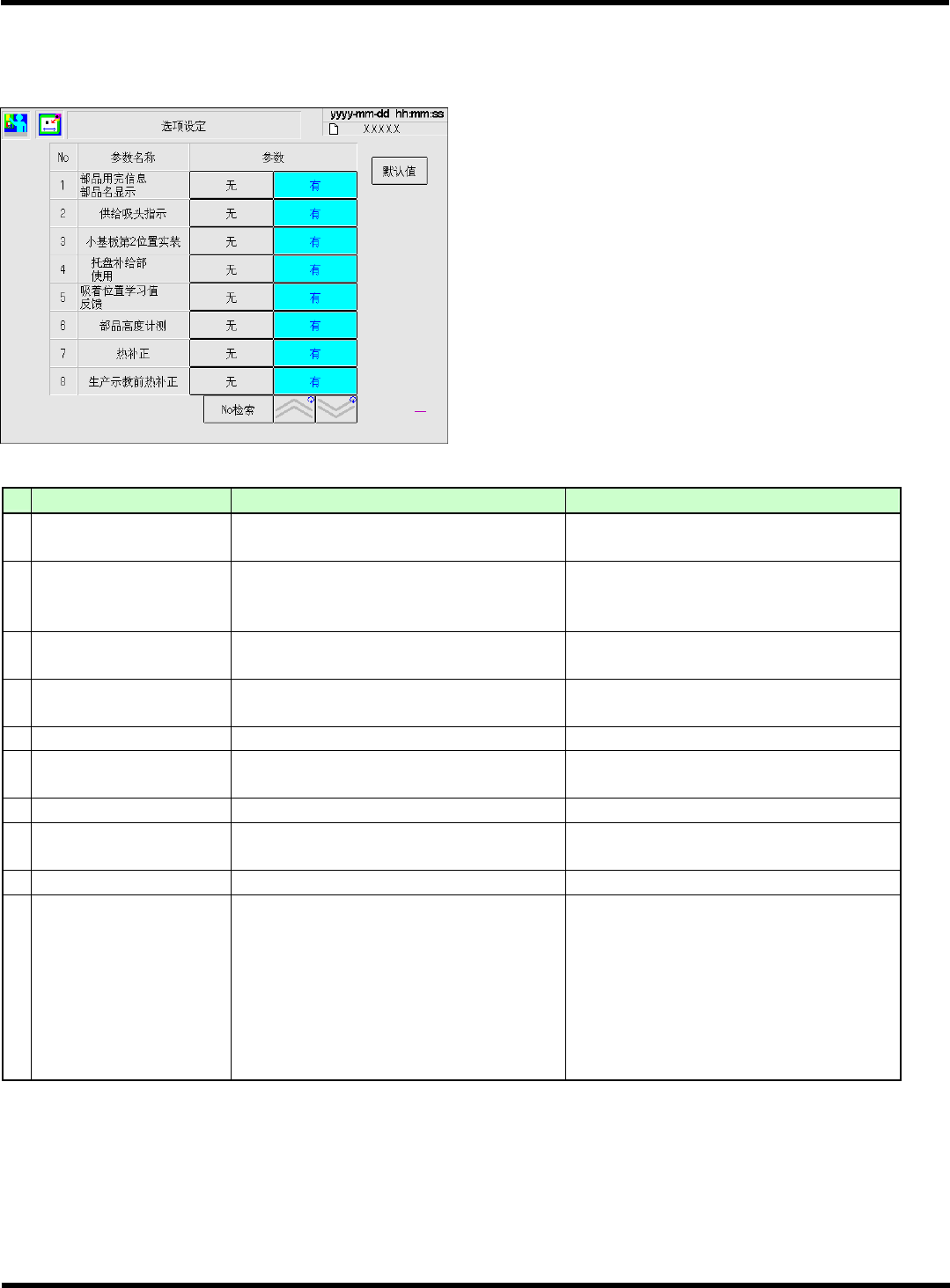 CM602-L 维修手册 2.1 关于机器参数 Pa ge 2- 14 2. [ 功能中止设 定 ] 参数名一览 ∗ 在此说明中根据规格的 不同而显示出来的参数名称 包括在内,列出所有参数名 称。 ( 参考画面 ) (1/2) No. 参数名 设定为 [ 有 ] 时 ( 默认值 ) 设定为 [ 无 ] 时 1 ‘ 部品用完信息 部品名显示 ’ 在自动运行过程中的部 品用完信息上显示 供料器地址和部品名。 自动运行过程中的部品 用完信息上…