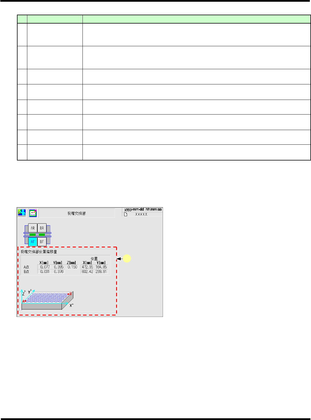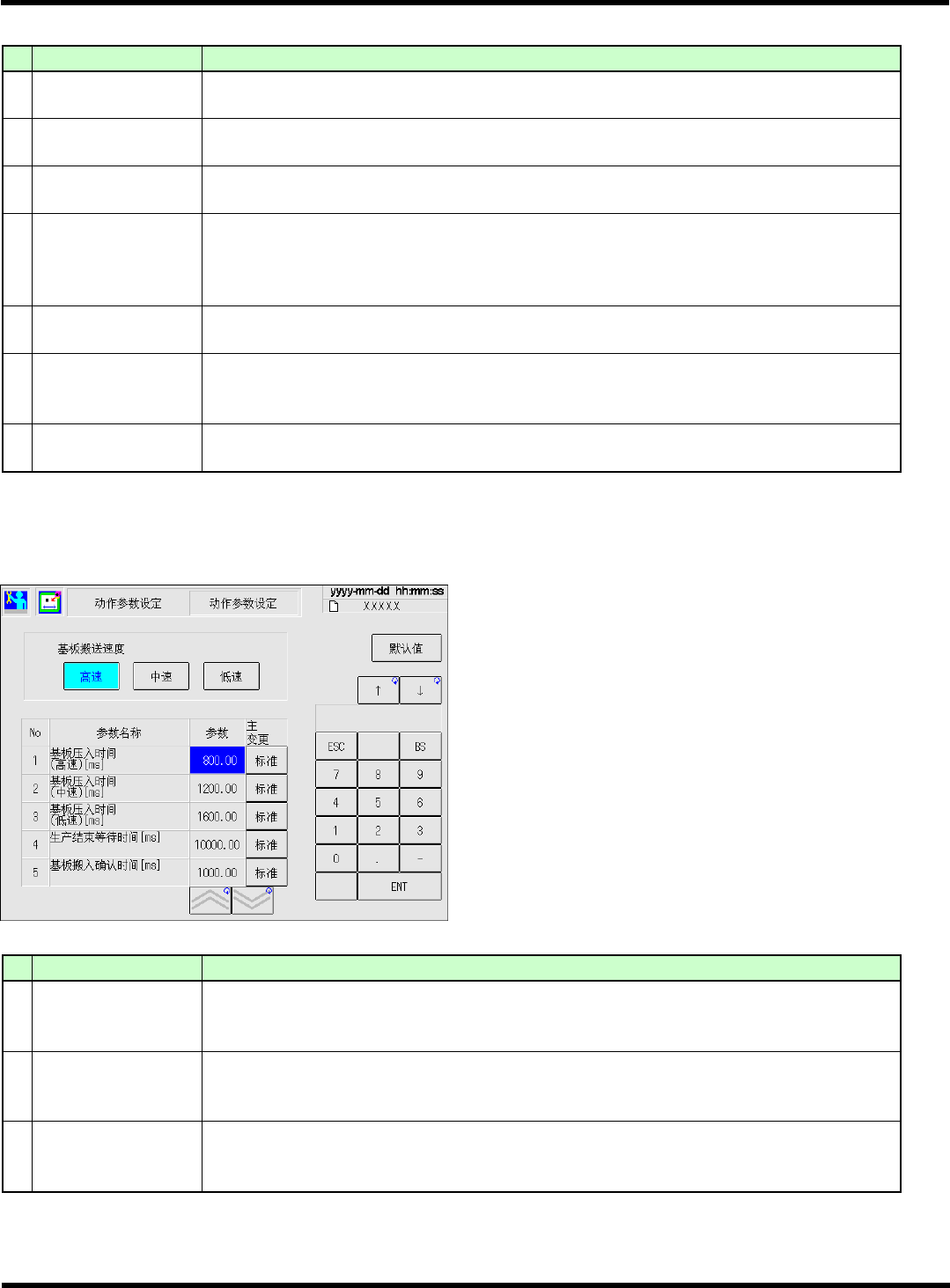 CM602-L 维修手册 2.1 关于机器参数 Page 2 -23 (2/2) No. 参数名 内容 4 ‘ 生产结束等待时间 [ms]’ 从前工序那里获得生产 结束信号后, 当 到设定时间即判断为生产 结束, 实装、 排出当前机器 上的基板后结束生产。 若在等待期间基板被搬 入时,将其作为最后一枚基 板。 5 ‘ 基板搬入确认时间 [ms]’ 自动运行过程中, 在已对前 工序发出要求信号时, 如果按下了暂 时停止按钮, 只 限大基板…