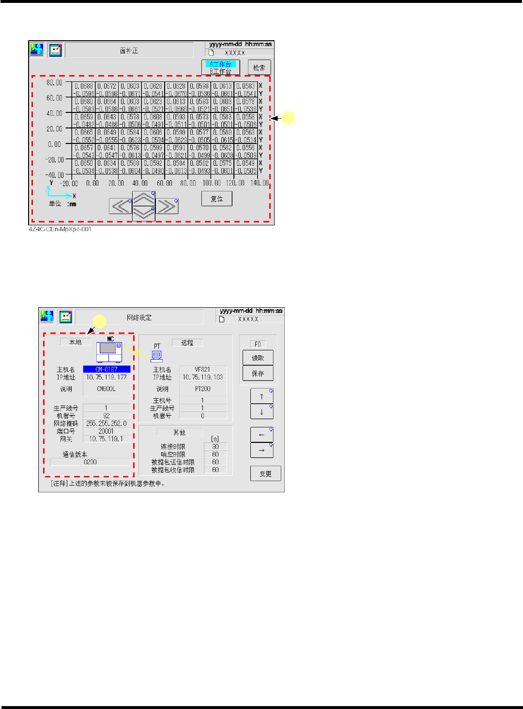 CM602-L 维修手册 2.1 关于机器参数 Pa ge 2- 24 2.1.6 热补正标记 a. ‘ 热补正标记的偏移量 ’ 显示热补正标记的位置 。 用于计算热补正的值。 2.1.7 实装位置 a. ‘ 实装位置偏移量 ’ 将实装位置全部补偿偏 移量时使用。 • [ 识别方式 ] 使用高速吸头 (12 吸嘴 ) 时 按此键,即可转换透过 识别和反射识别。 可以个别设定透过识别 时和反射识别时的各偏 移量。 使用通用吸头 (8 吸嘴…