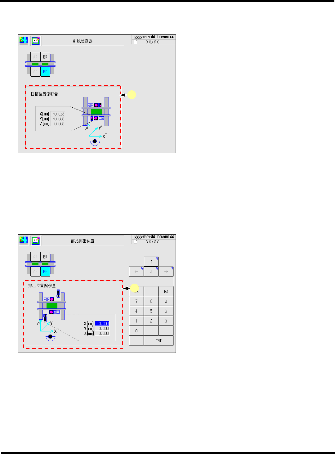 CM602-L 维修手册 2.1 关于机器参数 Pa ge 2- 34 2.1.24 部品厚度传感器 ( 选购件 ) ∗ 限高速吸头 (12 吸嘴 ) 、通用吸头 (8 吸嘴 ) 可以使用。 12 吸嘴用 a. ‘ 传感器位置补偿 ’ • 显示部品厚度传感器的 位置。 使用于部品厚度计测以 及吸嘴高度计测。 每个吸嘴位置 (pos) 都有数值。 8 吸嘴用 b. ‘ 传感器位置补偿 ’ • 显示部品厚度传感器的 位置。 使用于部…