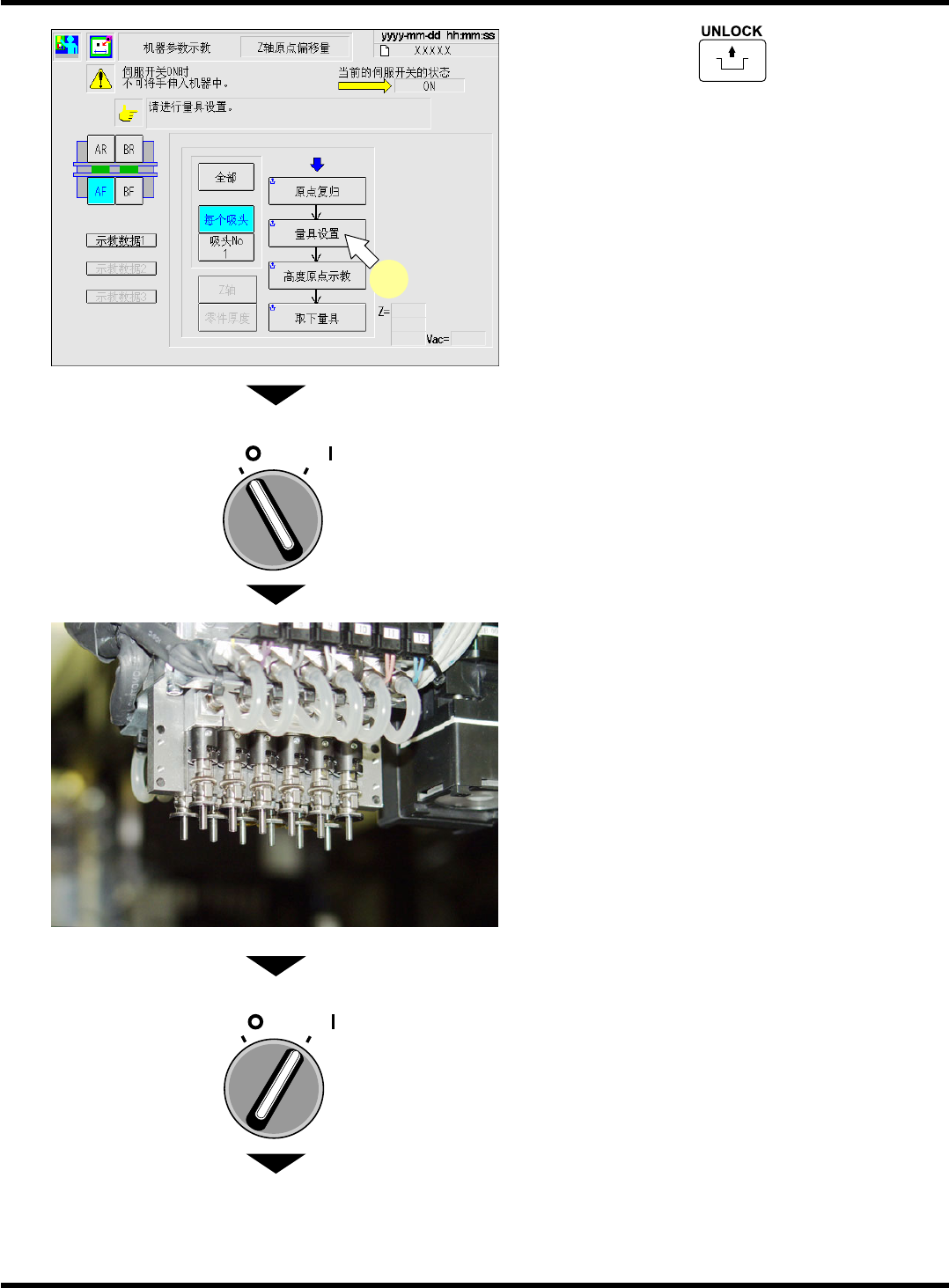 CM602-L 维修手册 2.2 机器参数的示教步 骤 Page 2 -41 4. 按操作面板的 + [ 量具设置 ] 。 5. 将伺服开关置于 OFF (O) 。 6. 打开安全盖 7. 在全部吸嘴位置上安装吸嘴。 高速吸头 (12 吸嘴 ) 时 ∗ 在全部吸嘴位置上安装 130S 吸嘴。 • 也可安装 120S 吸嘴。 • 也可安装 235CS 吸嘴。 ∗ 参照照片 通用吸头 (8 吸嘴 ) 时 ∗ 在全部吸嘴位置上安装 130 号…