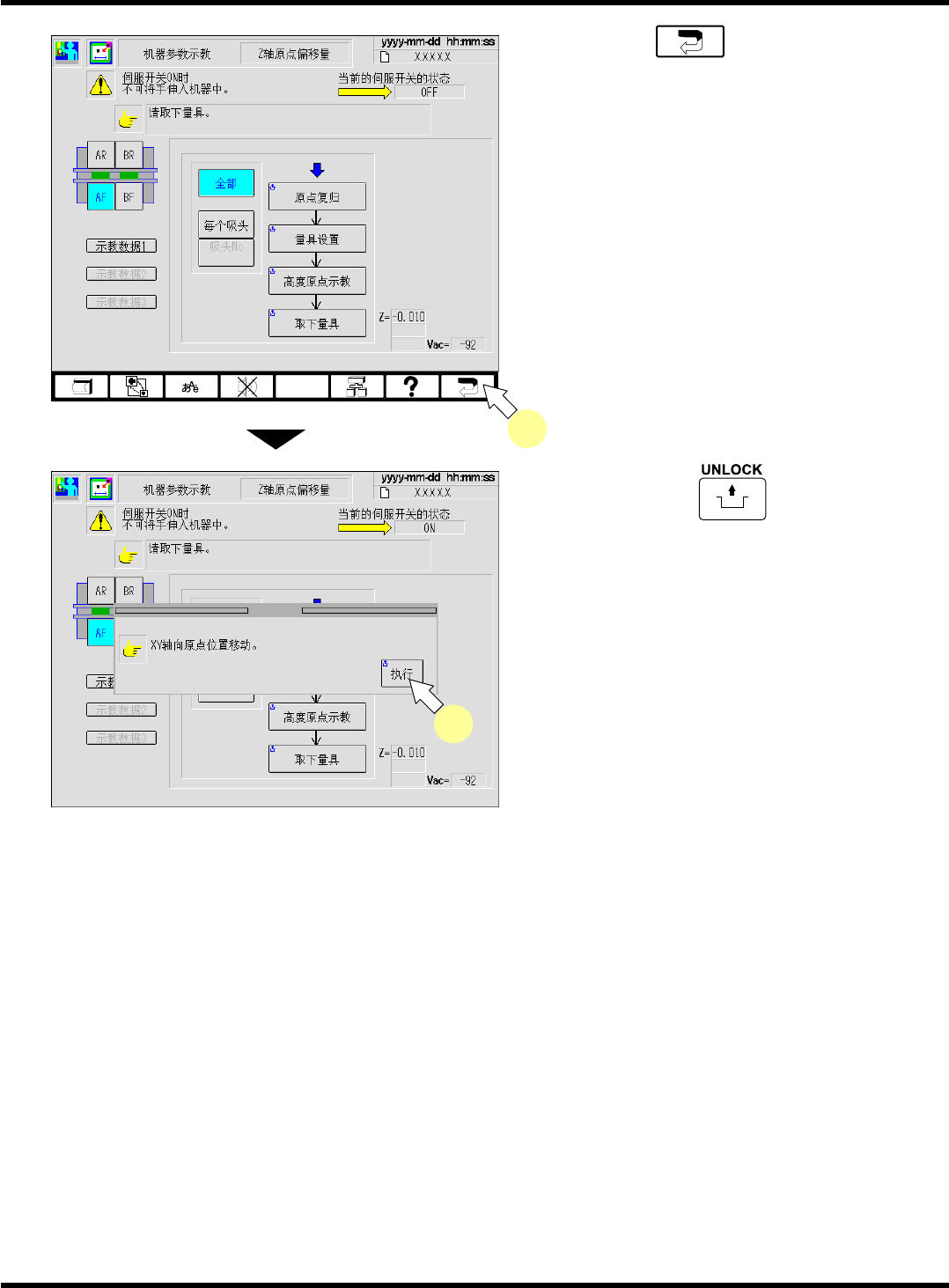 CM602-L 维修手册 2.2 机器参数的示教步 骤 Pa ge 2- 46 12. 按操作面板的 + [ 高度原点示 教 ] 。 13. 重复步骤 6. ~ 12. 的操作, 对从吸嘴位置 2 到吸嘴位置 12 之间进行示教。 ∗ 通用吸头 (8 吸嘴 ) 时, 请对 从吸嘴位置 2 到吸 嘴位置 8 之间进行示教。 14. 按操作面板的 + [ 取下量具 ] 。 15. 将伺服开关置于 OFF (O) 。 16. 打开安全盖。 1…