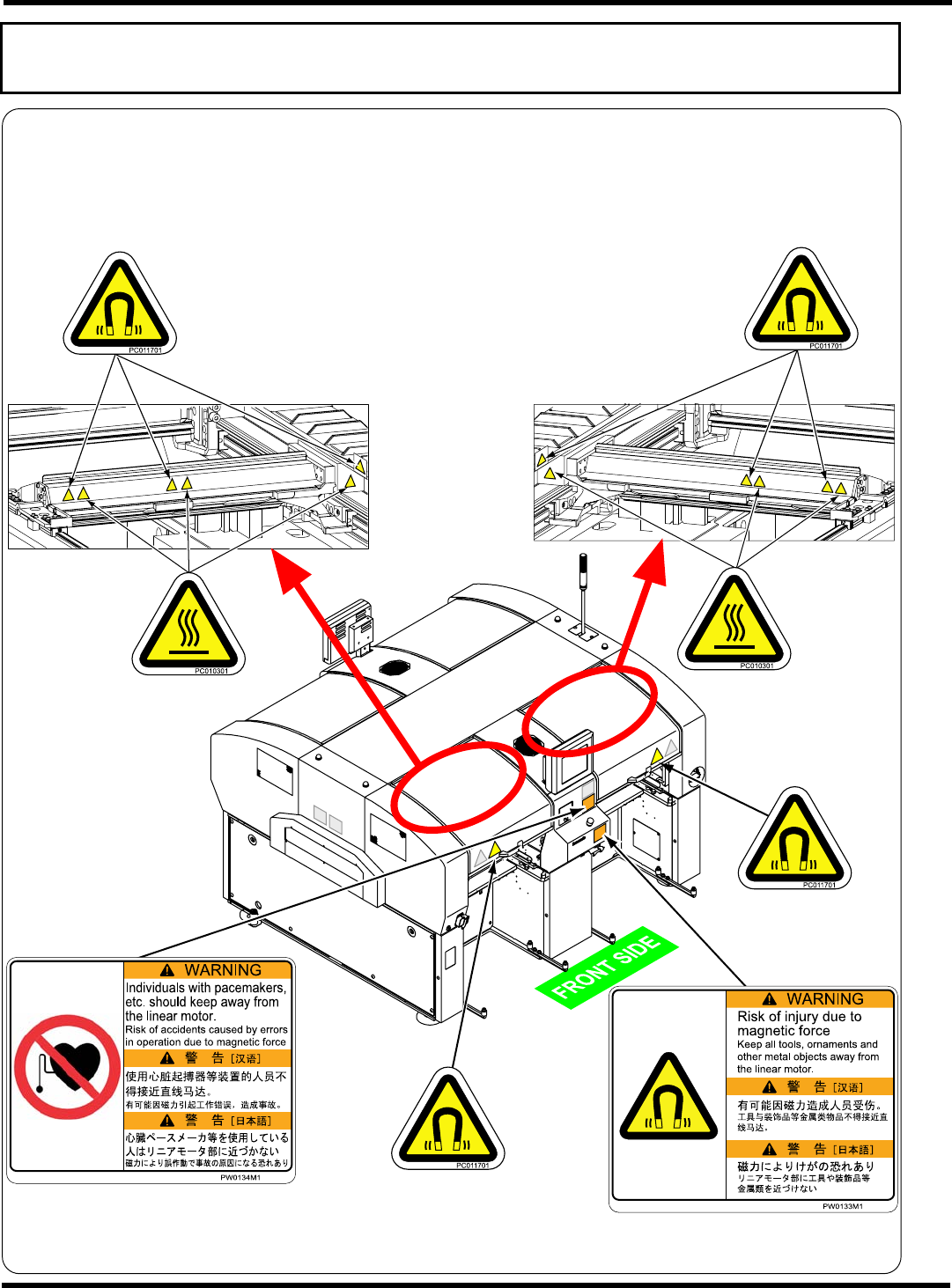 如下图所示,本机器贴有警告显示标牌。请遵守标牌的指示。
