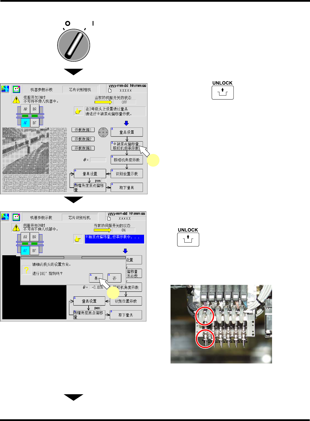 CM602-L 维修手册 2.2 机器参数的示教步 骤 Page 2 -65 4. 将伺服开关置于 OFF (O) 。 5. 打开安全盖。 6. 拆卸所有的吸嘴后,再拆卸吸嘴座。 高速吸头 (12 吸嘴 ) 时 • 取下吸嘴位置第 5 号的吸嘴座。 通用吸头 (8 吸嘴 ) 时 • 取下吸嘴位置第 3 号的吸嘴座。 7. 将量具设置于吸嘴位置上。 高速吸头 (12 吸嘴 ) 时 • 在吸嘴位置第 5 号上安装吸 嘴量具。 ∗ 参照照片 …
