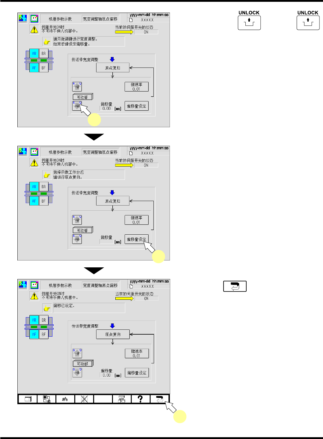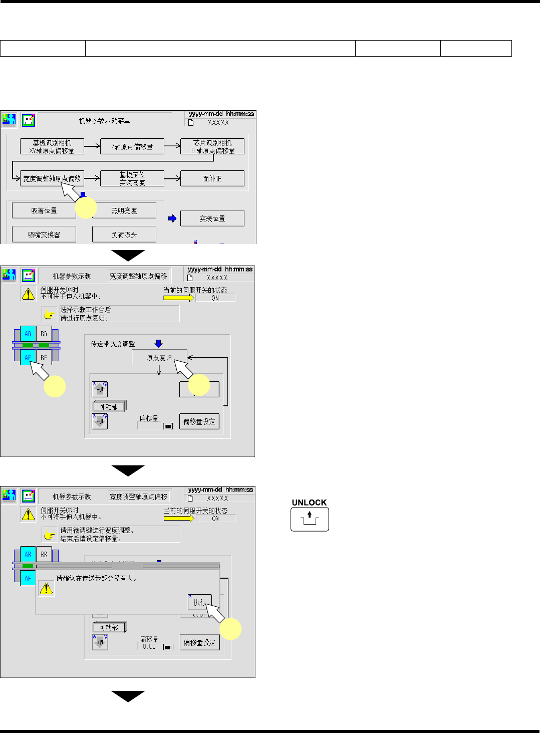 CM602-L 维修手册 2.2 机器参数的示教步 骤 Page 2 -81 5. 按操作面板的 + ⇑ 或者 + ⇓ 转动宽度调整轴,在用游标测量传送 带宽度的同时将宽度调整到 460.5 mm ~ 460.7 mm 。 • 按 [ 键速率 ] ,可以改变每次 按动 ⇑ 或者 ⇓ 的动 作量。 0.01 mm → 0.1 mm → 1 mm 6. 调整结束后,按 [ 偏移量设定 ] 。 • 示教结果将被保存。 ∗ 重复步骤 2. ~ …