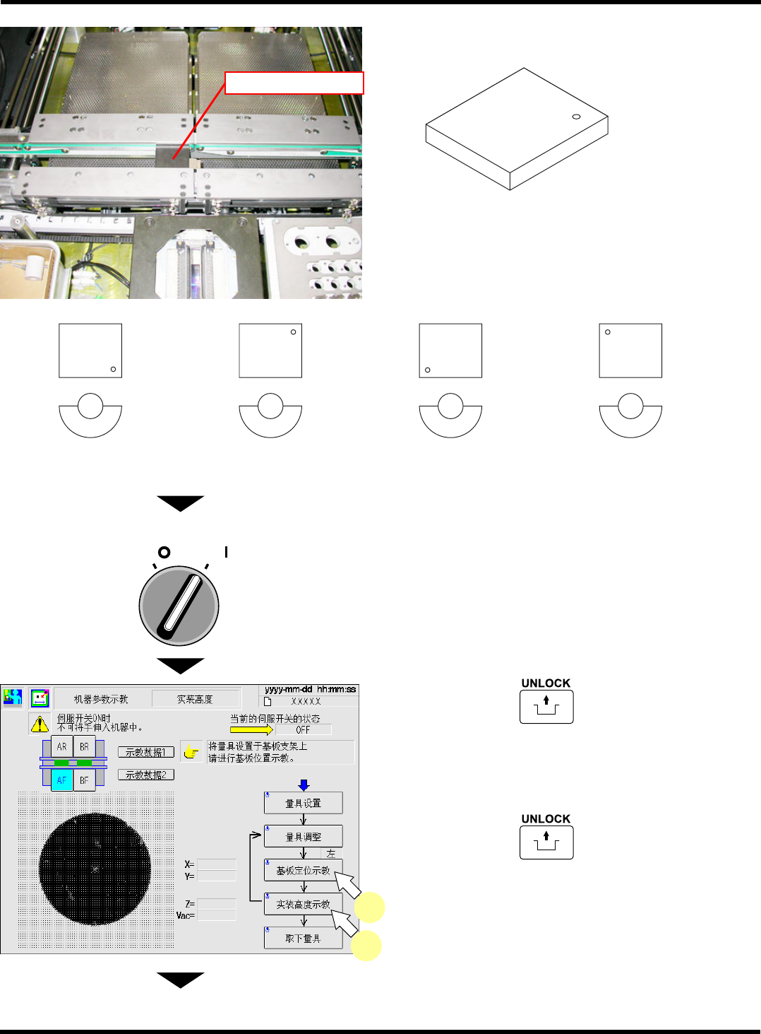 CM602-L 维修手册 2.2 机器参数的示教步 骤 Page 2 -83 4. 将伺服开关置于 OFF (O) 。 5. 打开安全盖。 6. 将吸嘴安装在吸嘴位置上。 • 高速吸头 (12 吸嘴 ) 时,在第 5 号位置上安装 130S 或 235CS 吸嘴。 • 通用吸头 (8 吸嘴 ) 时,在第 3 号位置上安装 130 号或 235C 吸嘴。 • 多功能吸头时, 将 1003 号吸嘴安装在第 3 号吸 头上。 7. 关闭安全盖…