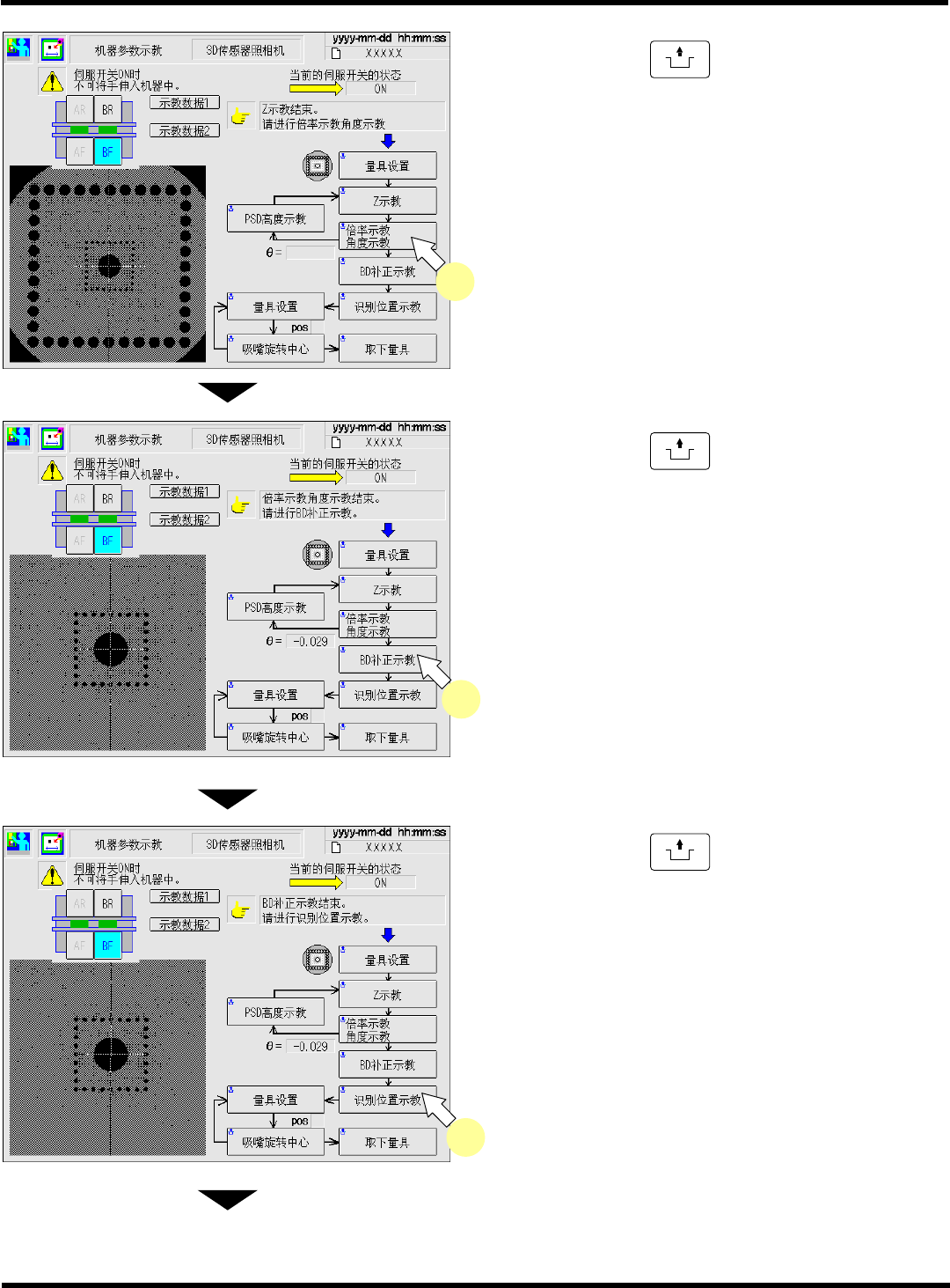 CM602-L 维修手册 2.2 机器参数的示教步 骤 Page 2-1 55 18. 按操作面板的 UNLOCK + [ 量具设置 ] 。 • 将会显示 “ 原点复归中 ...” 的信息。 19. 将伺服开关置于 OFF (O) 。 20. 打开安全盖。 21. 将吸嘴位置 3 号上的量具设置在吸嘴位置 1 号上 ( 画面上显示 pos1) 。 下一页 O FF ( ) ON ( ) S E RVO EJM6A -Mp-0169 EJ…