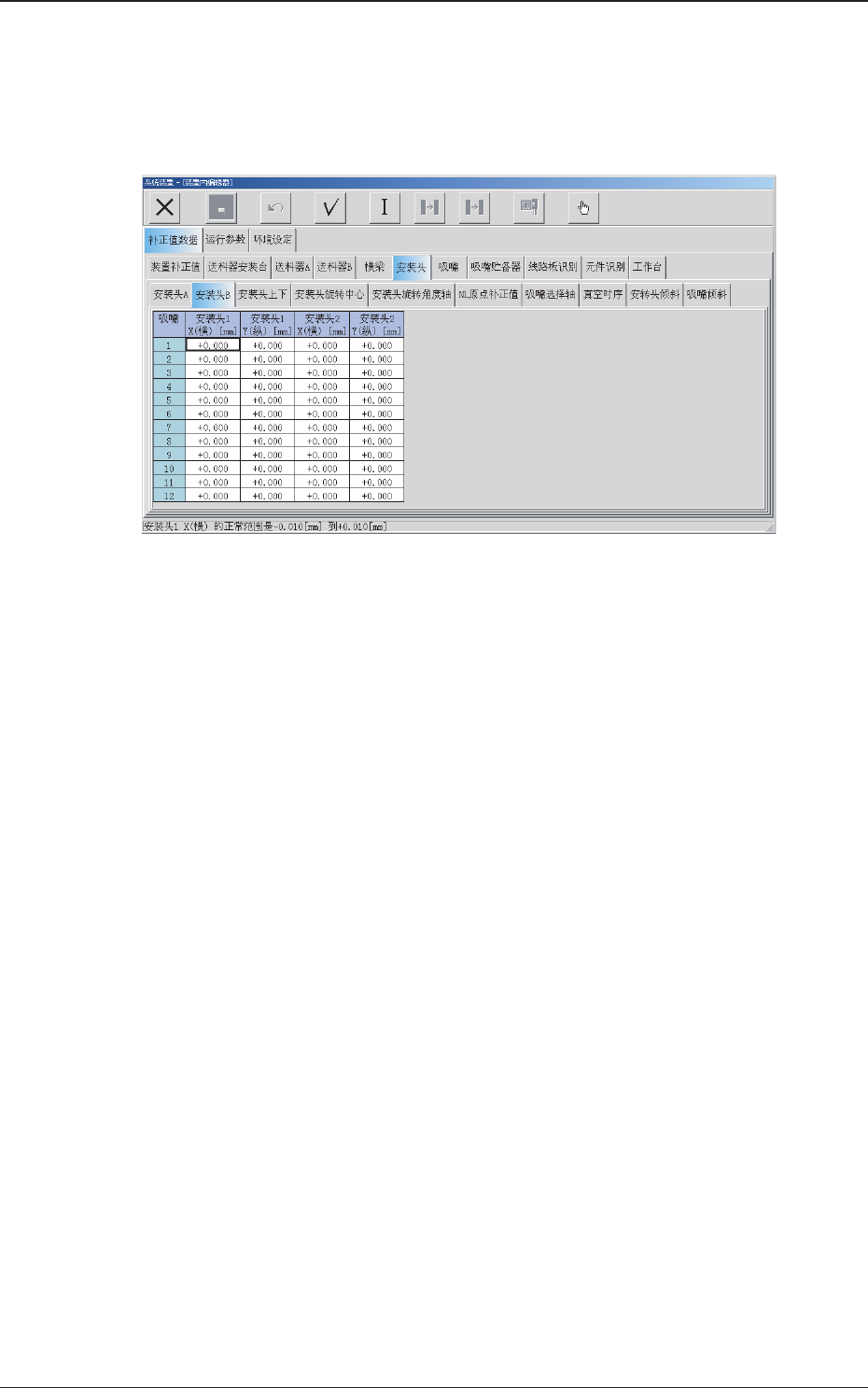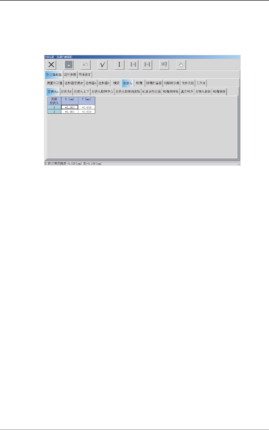 6 - 20 2.1 2.1 2.1 2.1 2.1 补正值数据 补正值数据 补正值数据 补正值数据 补正值数据 0506-001 2.1.5 2.1.5 2.1.5 2.1.5 2.1.5 安装头补正值 安装头补正值 安装头补正值 安装头补正值 安装头补正值 A A A A A 在 “ 补正值数据 ” 选项卡中,按 [ 安装头 ]Tab ,再按 [ 安装头 A] Tab ,显示以下选项卡。 Fig.3F16 Fig.3F16 Fig.…