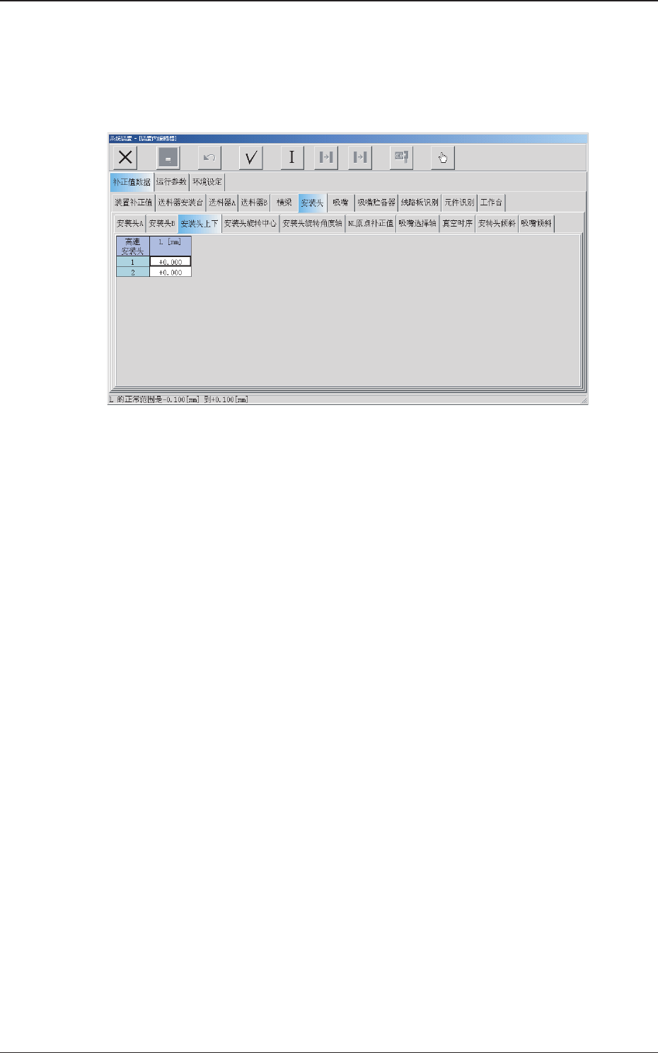 6 - 23 2.1 2.1 2.1 2.1 2.1 补正值数据 补正值数据 补正值数据 补正值数据 补正值数据 0506-001 2.1.8 2.1.8 2.1.8 2.1.8 2.1.8 安装头旋转中心补正值 安装头旋转中心补正值 安装头旋转中心补正值 安装头旋转中心补正值 安装头旋转中心补正值 在 “ 补正值数据 ” 选项卡中,按 [ 安装头 ]Tab ,再按 [ 安装头旋转 中心 ]Tab ,显示以下选项卡。 Fig.3F19 …
