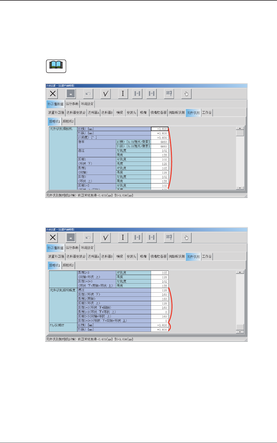 补正值数据 选项卡中,按[ 元件识别]Tab,再按[ 照相机 1]