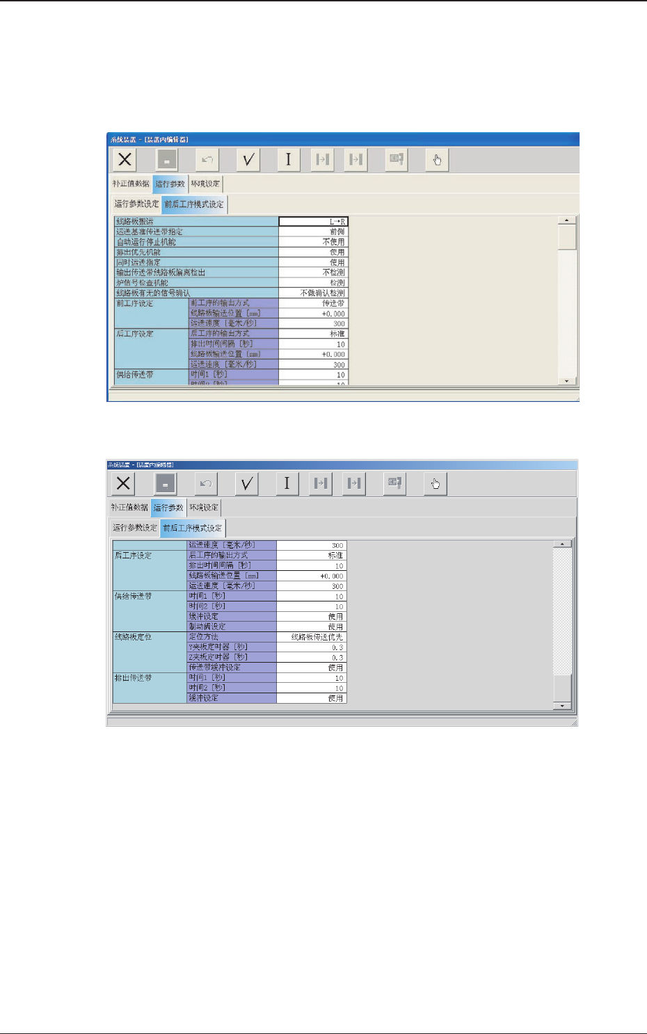 在 “ 运行参数 ” 选项卡中,按[ 前后工序模式设定]Tab,显示以下
