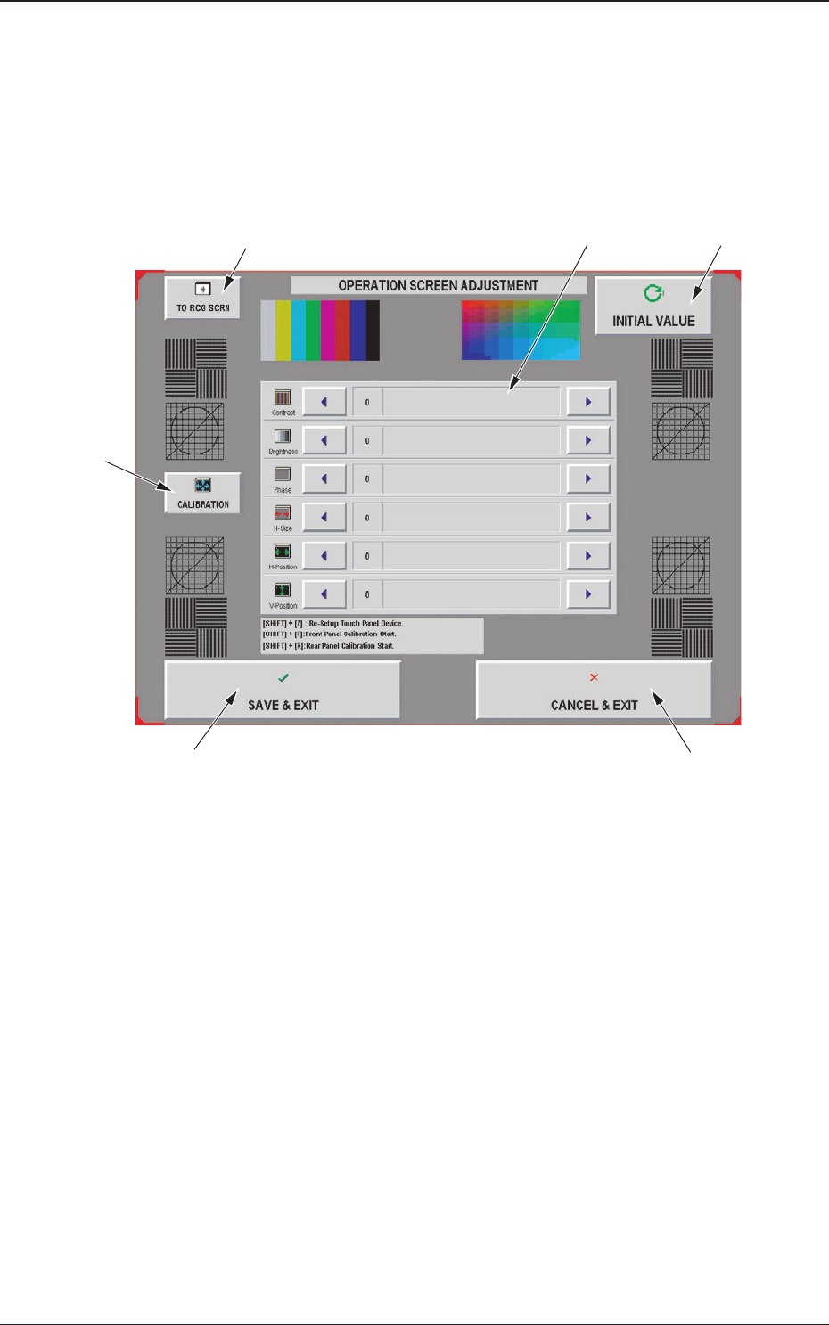 6 - 96 8. 8. 8. 8. 8. 界面调整 界面调整 界面调整 界面调整 界面调整 可以进行触摸屏的调整。 在 “ 系统设定 ” 菜单栏中,按 [ 界面调整 ] 按钮,显示触摸屏的调 整界面。 Fig.3F84 Fig.3F84 Fig.3F84 Fig.3F84 Fig.3F84 触摸屏调整界面 触摸屏调整界面 触摸屏调整界面 触摸屏调整界面 触摸屏调整界面 可以调整屏幕的对比度、亮度、位相、色调、倾斜度等。 8. 8. 8…