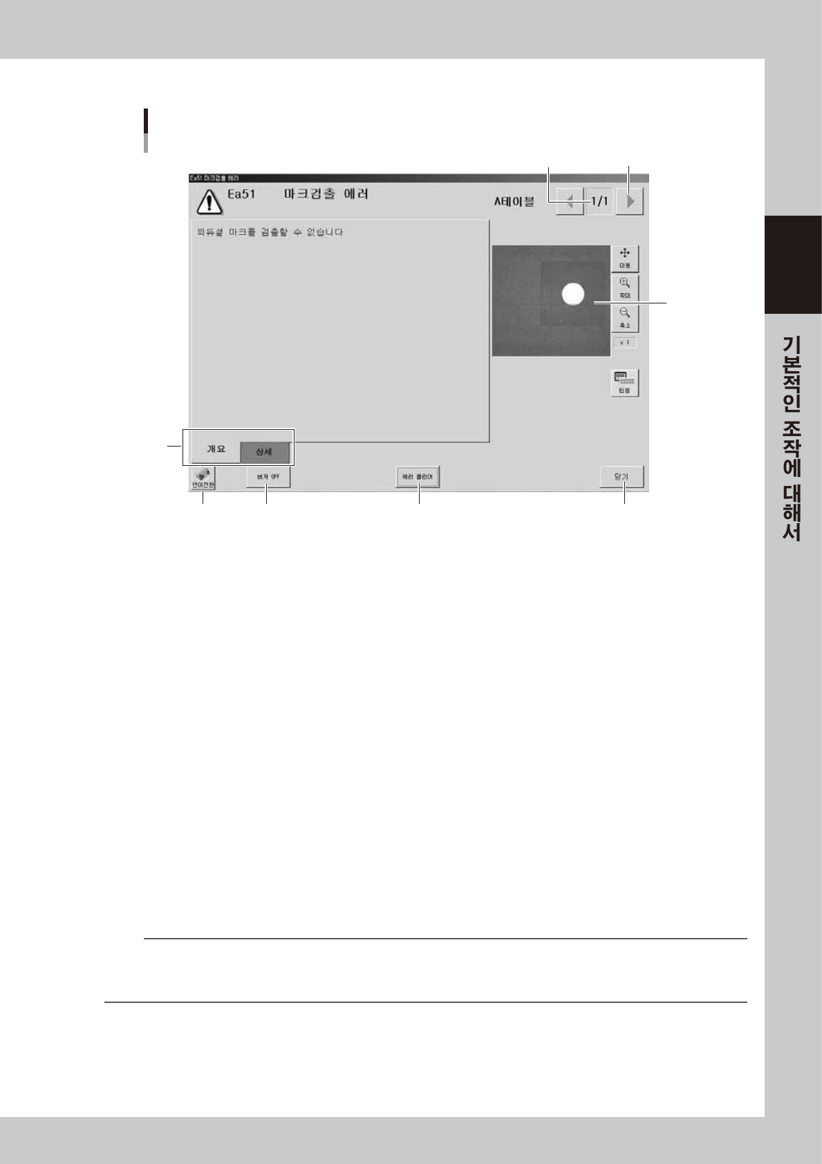 2-1 1 2 ■ 에러 화 면에 대 해서 에러화면의 구성 예 1 3 2 4 7 5 6 [에러전환] 버튼 마크검출 에러 2 8 2 03 -K M K- 0 0 1 . 에러수량표시 현재 표시 중인 에러 와 에 러 총수량 을 표시 합 니 다 . 복수의 에러 가 발생 한 경우는 , 좌우의 [ 에러 전 환 ] 버튼 을 눌러서 에 러 화면 으로 전환할 수 있습니 다 . 2. 인식화 상표 시 ( 부…