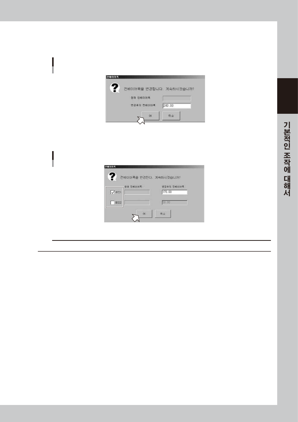 [ 컨베이어폭 ] 버튼을 누르면 ,「컨베이어 폭」대화창이 표시되므로 , 컨베이어 폭을 확인하고 [OK] 버튼을 눌러 주십시오 .