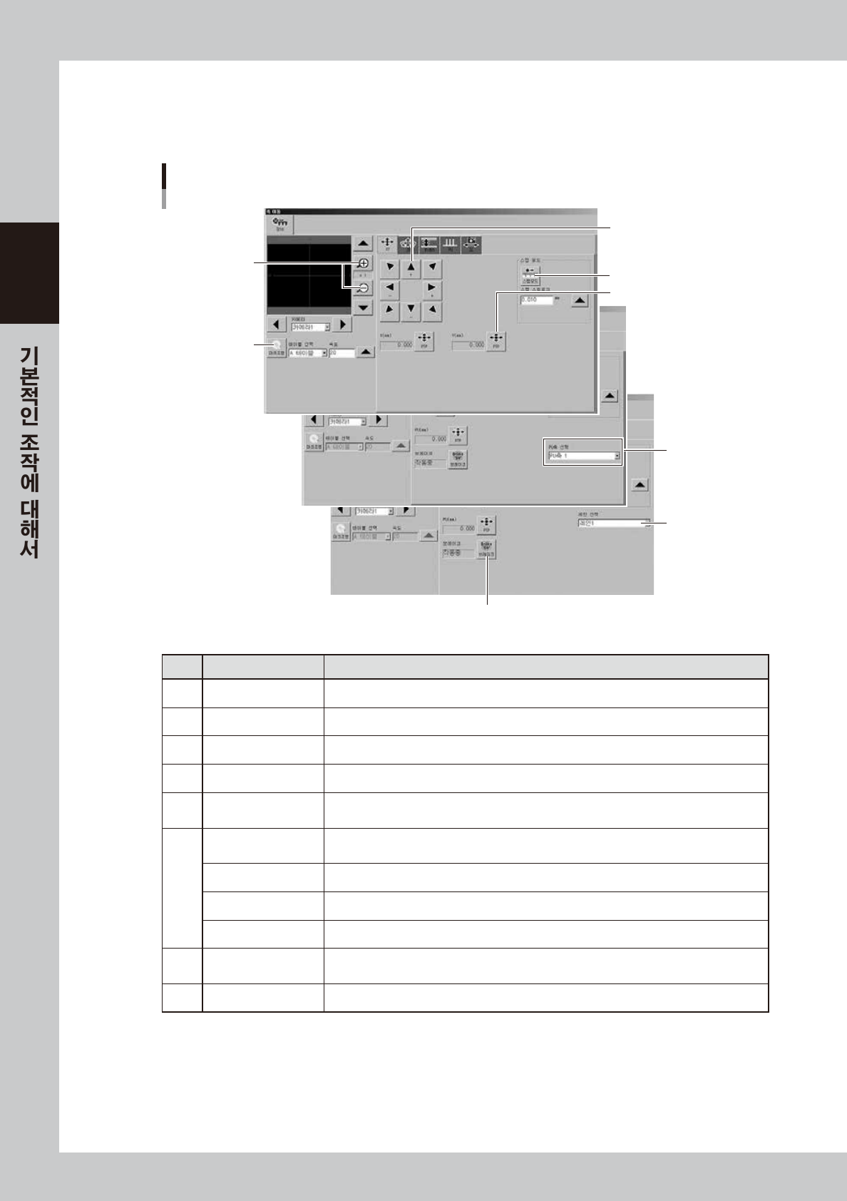 「장치」화면내의 수동조작 버튼에 관한 내용과 기능에 대해서 설명합니다.