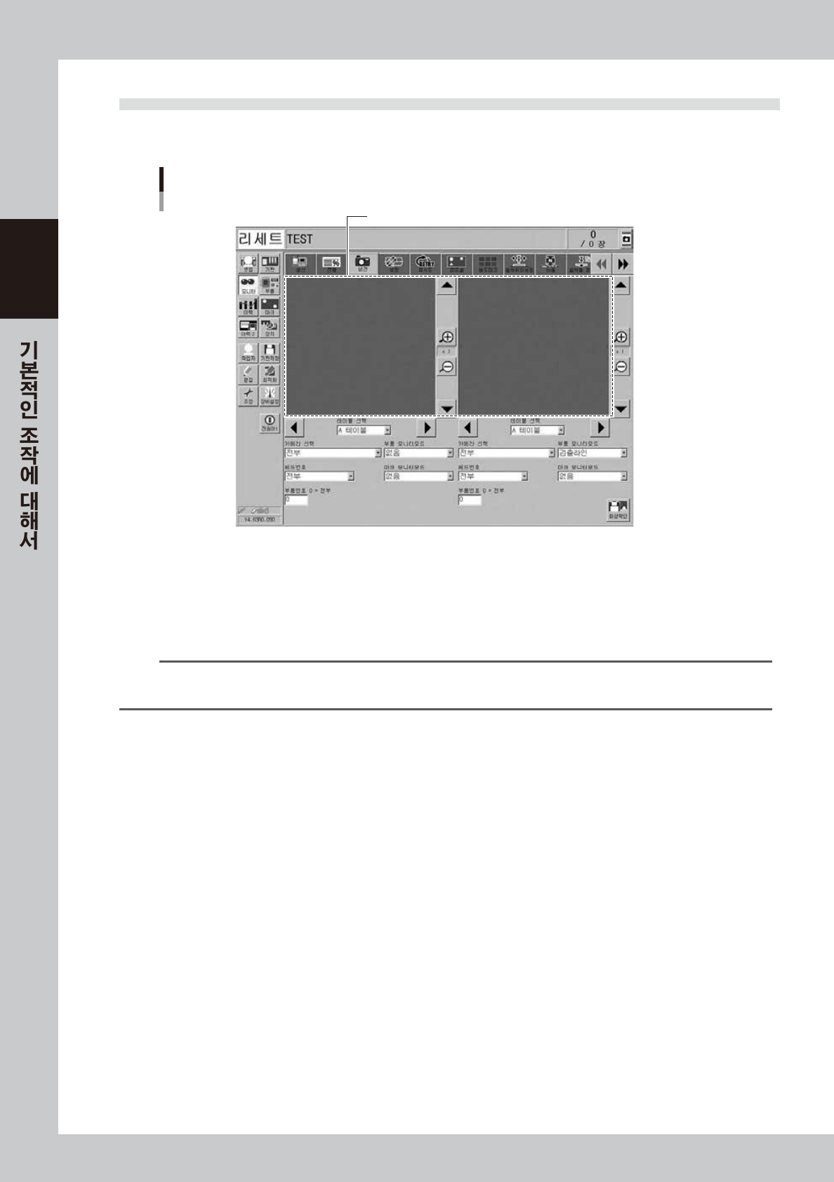 비젼 모니터에는 좌우 2 개의 화상 ( 이미지 ) 을 표시할 수가 있습니다. 테이블 , 카메라 , 헤드 , 부품번호를 각각 선택하면 인식화상
