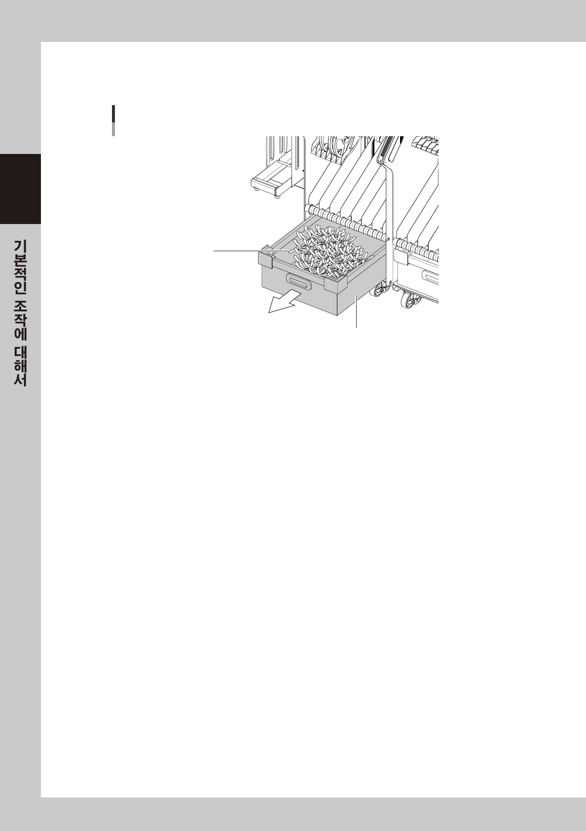 2-64 2 █ 캐리 어테이프의처리에대해서 사용 종 료 한 캐 리어 테이 프 는 아 래 그 림과 같이 빈 테이 프 박스내 에 쌓입 니 다 . 정기 적으로 박 스내 부를 확 인해 서 , 캐 리어 테 이프 를 처 리해 주 십 시 오 . 캐리어 테이프의 처리 빈 테이프 박스 컷트된 캐리어 테이프 27229-KM K -0 0
