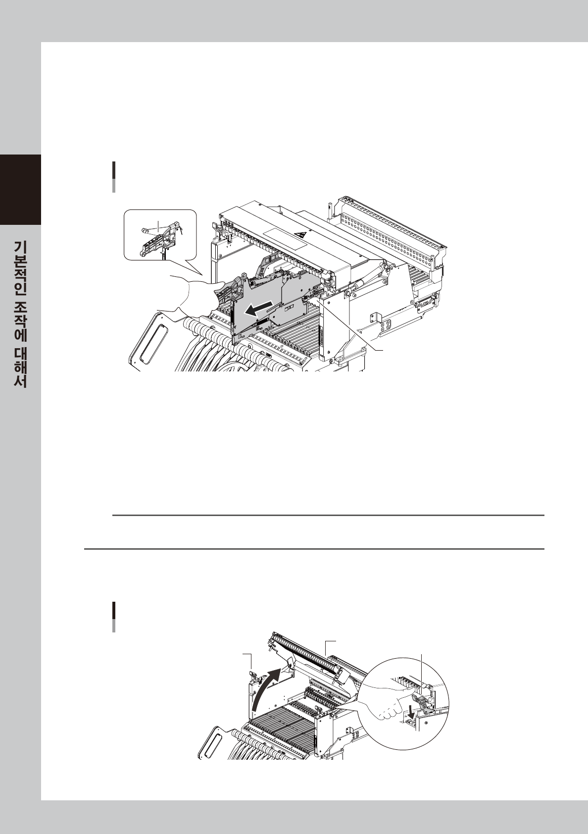 용 대차의 가이드 레일 커버를 열기 위해서는 , 장비의 안전 커버를 오픈할 필요가 있습니다.