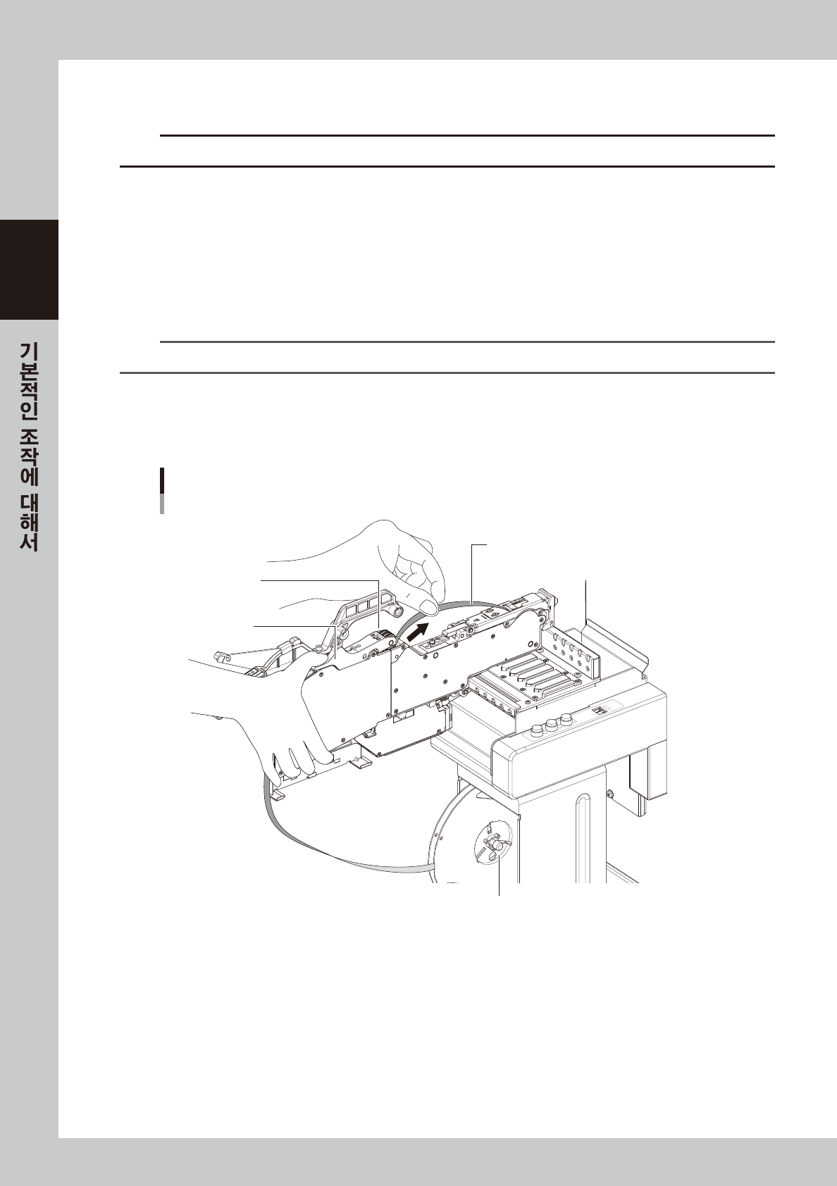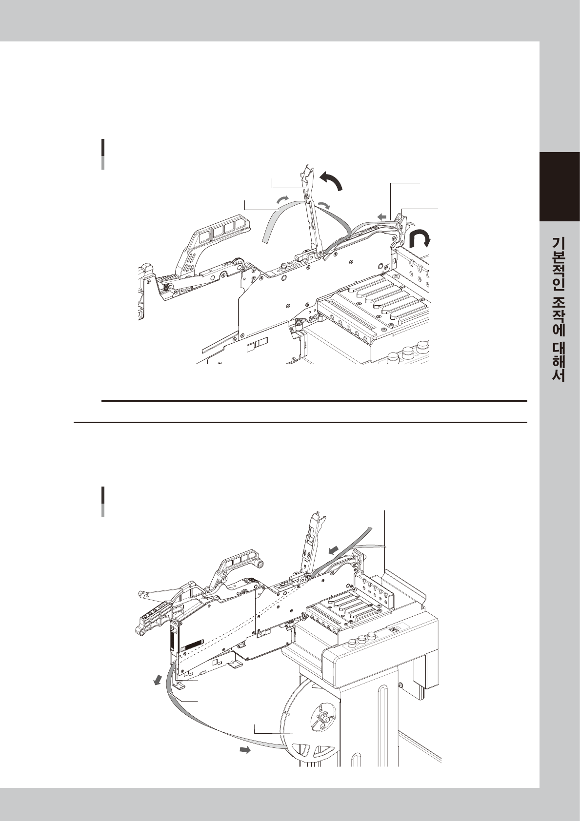 1. 테이프 가이드 프론트 레버를 들어 올리면서 아래 그림의 화살표 방향으로 젖히고 , 테이프가이드