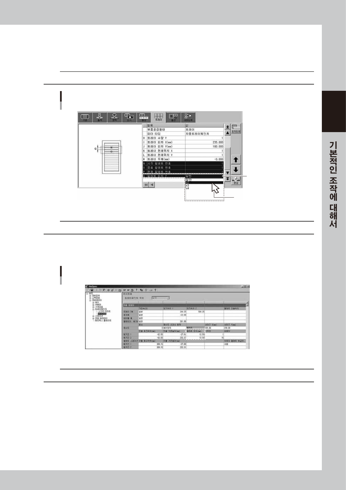 장비의 팔레트 피치 설정은 ,「셋업」화면의 [ 장비설정 ]-「VmSpec」화면의「설정」-「장비 데이터」-「트레이체인저」