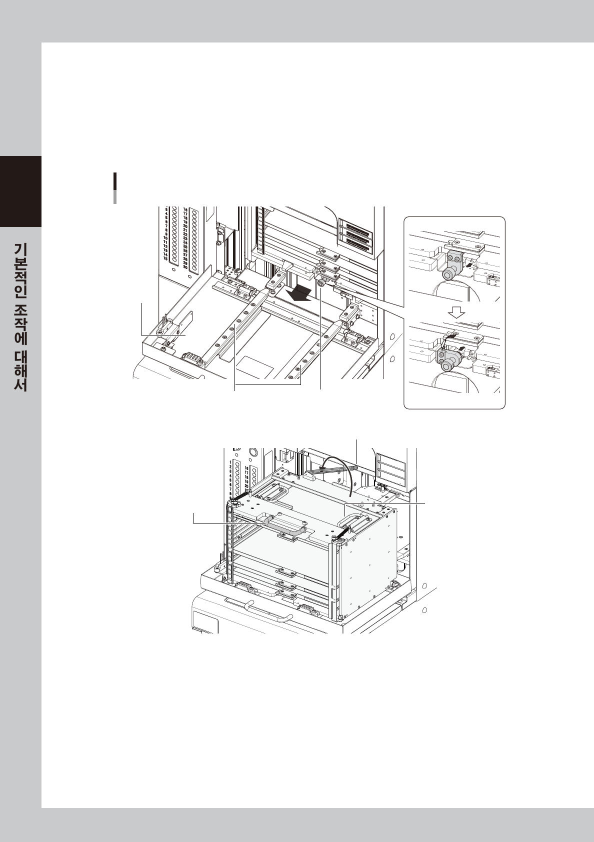 4. 매거진 상면의 좌우에 있는 운반용 핸들을 단단히 잡고 , 매거진을 가이드에서 내립니다 .