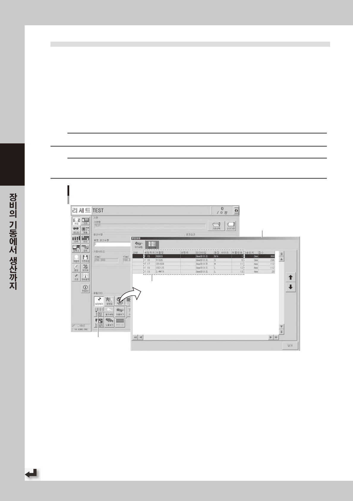 「셋업」화면의 [ 부품보기 ] 버튼을 누르면「셋업일람」화면이 표시됩니다 .