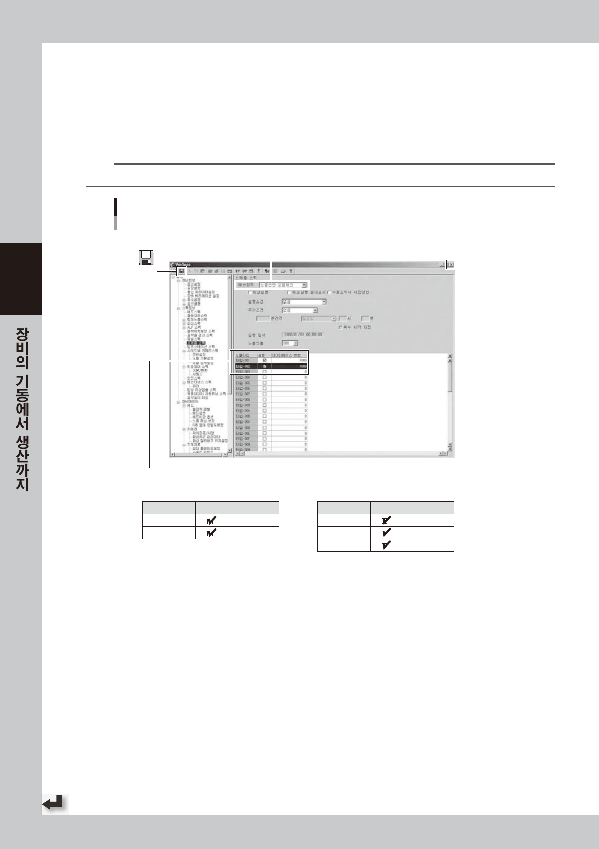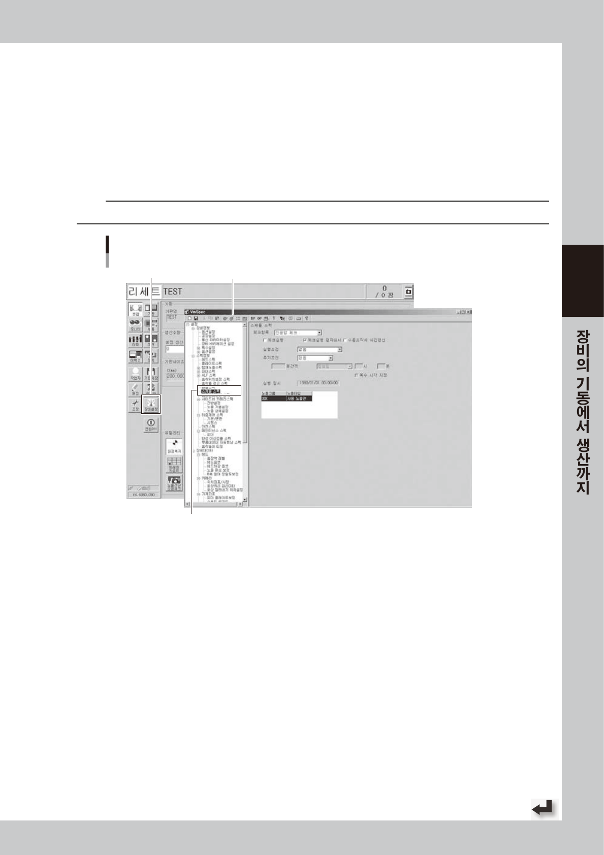 3-25 3 █ 「노즐 선단 오염체크 」 설정에 대 해 서 다음과 같이 「노 즐 선 단 오염체 크 」 의 설정 방 법에 대해 서 설명 합니다 . 1 「 셋 업 」화 면 의 [ 장 비설정 ] 버튼 을 누 릅 니다 . 「VmSp ec」 화 면 이 표시 됩 니 다 . 2 「 스케 줄 스 펙」 을 선 택합니다 . 「VmSp ec」 화 면 좌측의 「 스케 줄 스펙 」 을 선 택 해 주십시 오 . n …