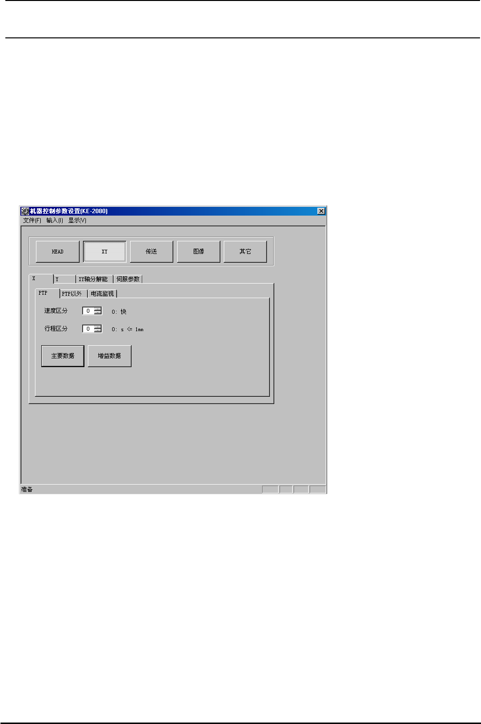 R e v 1 . 00c 机械控制参数 3-7 3-2 XY 选择了起动画面的 [XY] 按键之后,就会显示出如图 3-2-1∼ 图 3-2-5 所示的表格。 3-2-1 PTP 动作的起动画面 选择了 [X][PTP] 或 [Y][PTP] 之后,就会显示出如图 3-2-1 所示的表格。 画面为 [X] 时的情形, [Y] 也一样。 图 3-2-1 PTP 动作的起动画面 把 速度类别 、 行程类别 设定到想编辑的目…